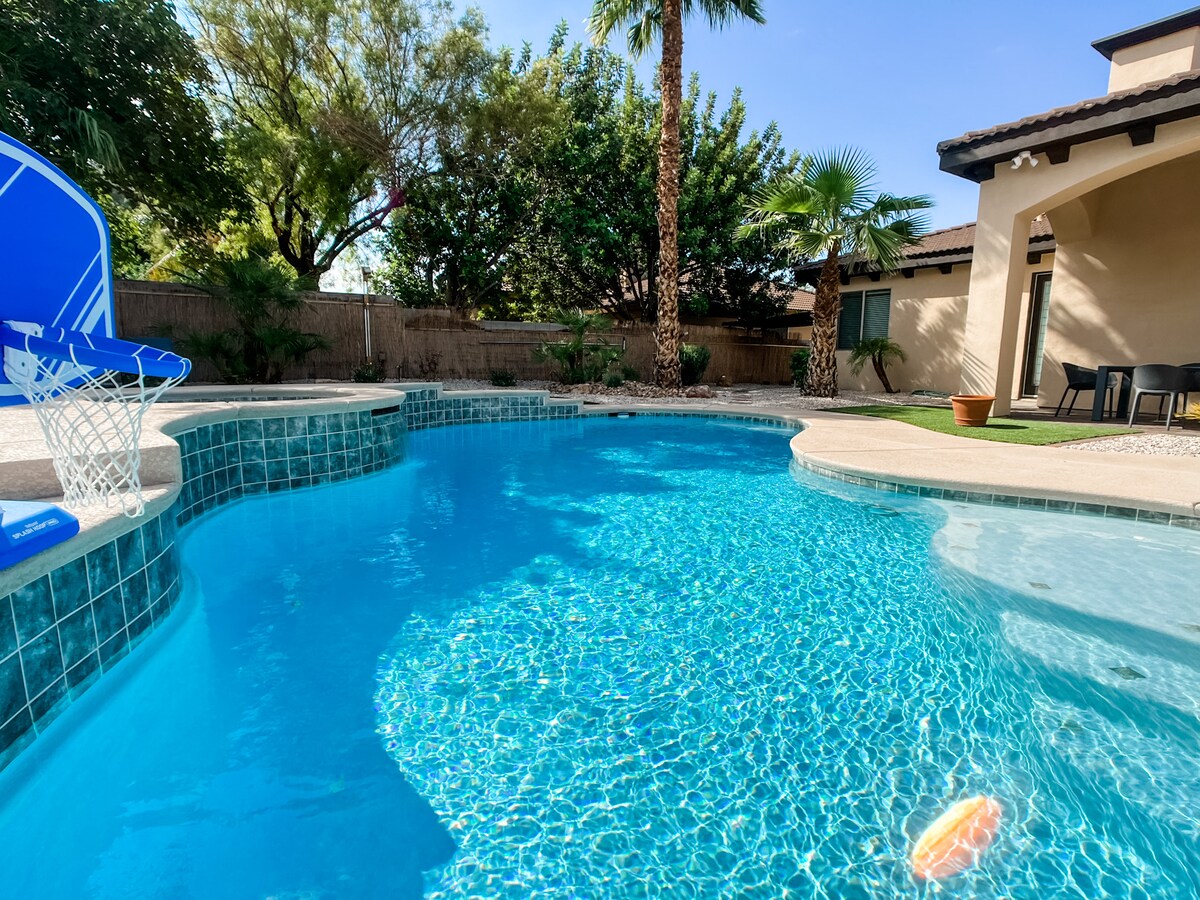 在亨德森的這座大型莊園中,遠離塵囂,享受安靜祥和的住宿體驗。 這個美麗的房源有 4 間臥室和 3 間衛浴,提供私人泳池、籃球場、高爾夫練習場、撞球桌、沙狐球桌、桌上足球、乒乓球和電子遊戲機。 這是一個非常安靜的社區。 請尊重鄰居和街區! 我們非常重視規則,並會透過監視錄影器來監控派對和活動。 請在預訂前閱讀這些內容!