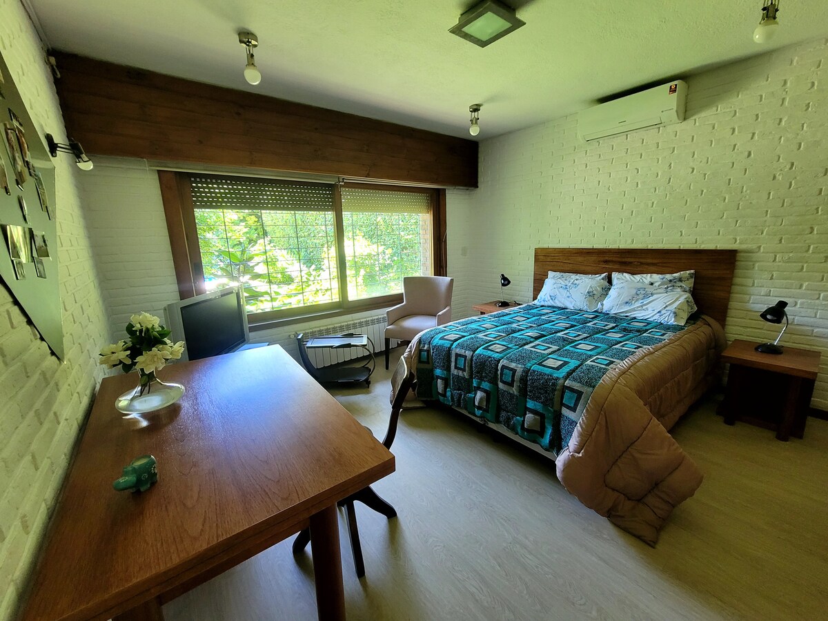 Casa minimalista en planta alta, rodeada de verde, con terraza, gran balcón y vista al hípico. Funciona como 3er piso. Loft luminoso, cama super king, vidrios dobles, losa radiante, aire acond y cortinas blackout en todas las ventanas. Entrada independiente, buen aislamiento. Mi taller está en planta baja con acceso totalmente separado. Ideal para 1 o 2 personas tranquilas que buscan descanso cerca del río y gastronomía, a 30 min de CABA y Tigre. No apta para eventos/producciones.