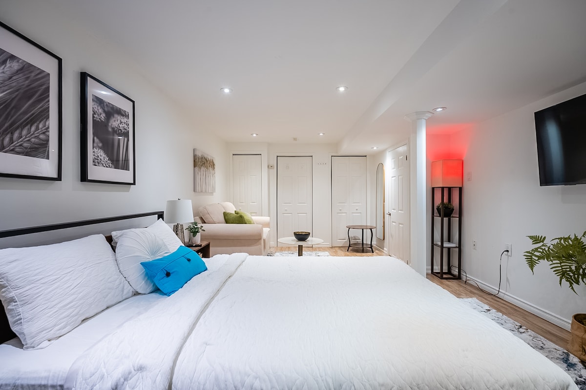 開車1分鐘即可抵達星巴克、麥當勞等。 開車5分鐘即可抵達GO火車。 開車19分鐘即可抵達多倫多皮爾遜機場。 您可以獨享整個地下室單位、單位內門鎖,包括私人入口及其專用停車位。絕對沒有共用區域-享受完全的隱私和擁有自己的空間的自由。 無論您是尋找溫馨的情侶度假勝地,還是尋找安靜時光的獨自度假勝地,這裡絕對是理想的住宿地點。