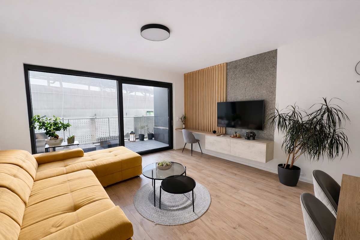 布拉提斯拉瓦Nové Mesto的現代1BR —時尚、安靜,靠近生鮮市場。 舒適的客廳、設計師沙發、設備齊全的廚房、雙人床、現代化的浴缸和洗衣機、空調、快速Wi-Fi和工作空間。 陽臺、可選的私人停車位。 步行3分鐘即可抵達巴士站;步行10–15分鐘即可抵達舊城區。 靠近VIVO購物中心、體育場和Kuchajda湖。 非常適合商務或休閒住宿。