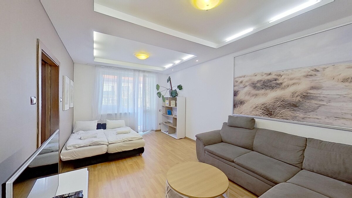 Relax in this stylish 10th-floor studio in Olivia Residence with breathtaking views of Bratislava’s city center. The space features a comfy bed, fully equipped kitchenette, smart TV, and fiber optics Wi-Fi. Just an elevator ride away, Fresh Market offers dozens of restaurants, cafés, and shops to explore. Ideal for business trips or weekend getaways, with quick access to public transport and downtown.