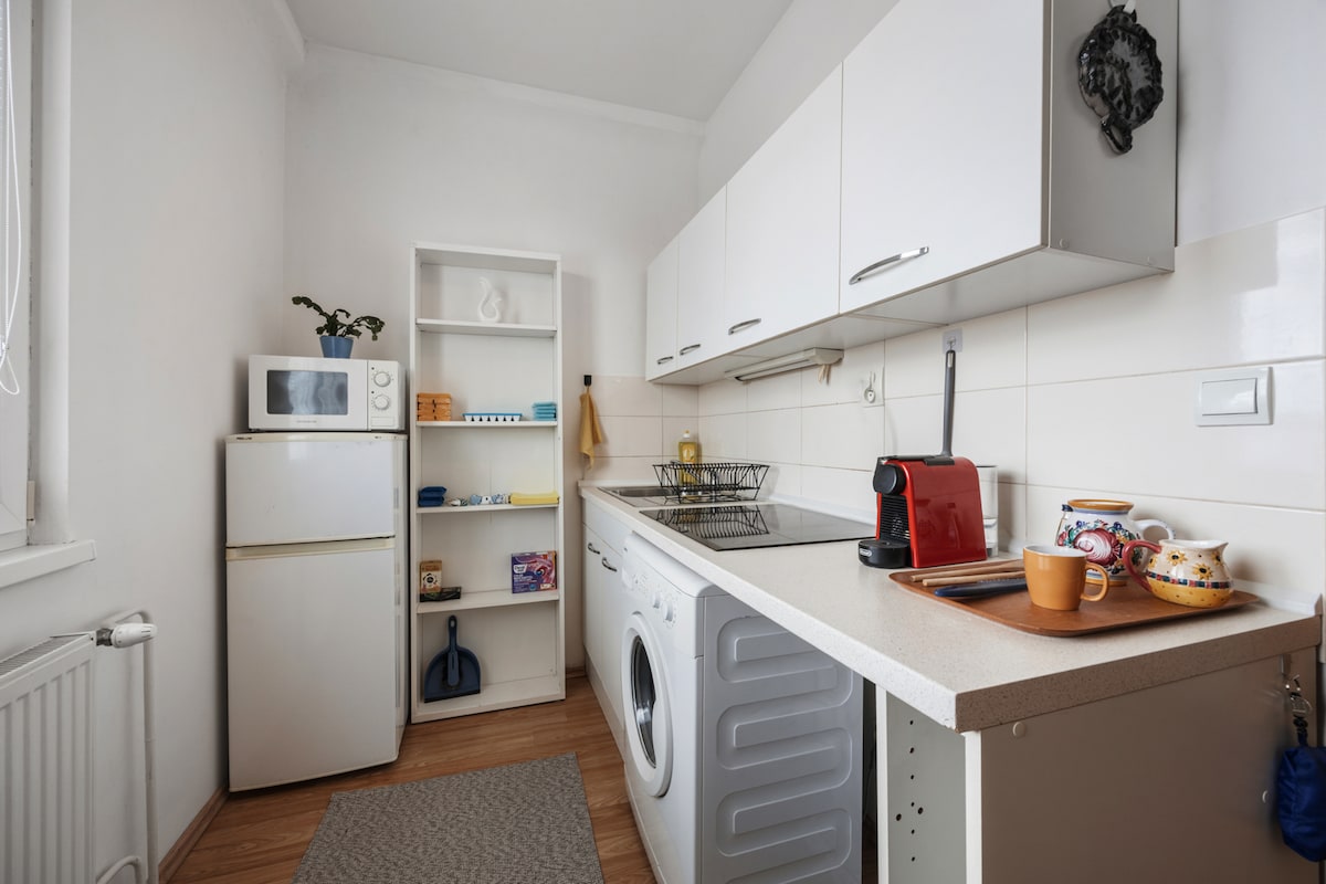 一間公寓,步行即可抵達許多餐廳、俱樂部和布拉迪斯拉發地標(如主廣場、歷史歌劇院、舊市政廳)。從附近的公共交通站前往城市各處很方便。設備齊全的廚房,備有餐具和基本廚具。折疊式雙人床。折疊沙發(展開後可舒適入住一人)。配有浴缸的浴室。提供床單和毛巾。