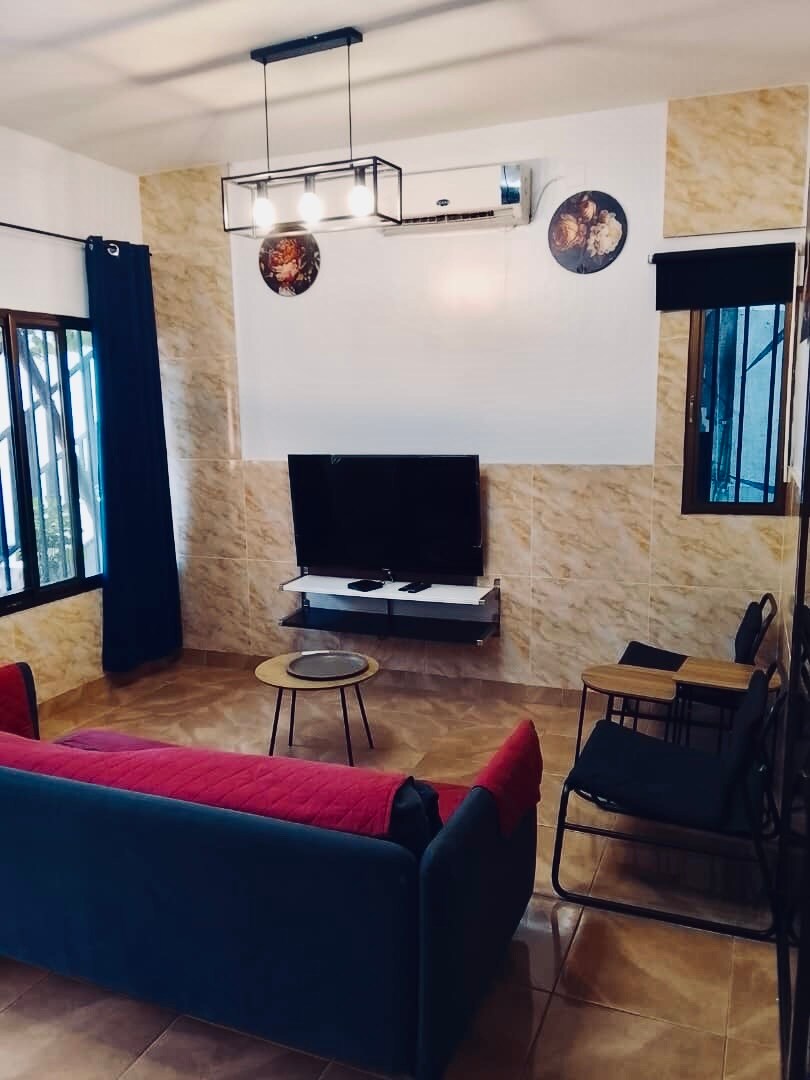 •迷人的公寓,設備齊全,兩間臥室、客廳、小廚房區域、浴室和現代化廁所。 •配有大型55吋QLED螢幕,可收看Netflix和WiFi連線。 •日夜保安, 24小時清潔服務,配有警報系統和電子圍欄以及閉路電視攝影機。 •停電時的電子發電機、水批和私人停車場。