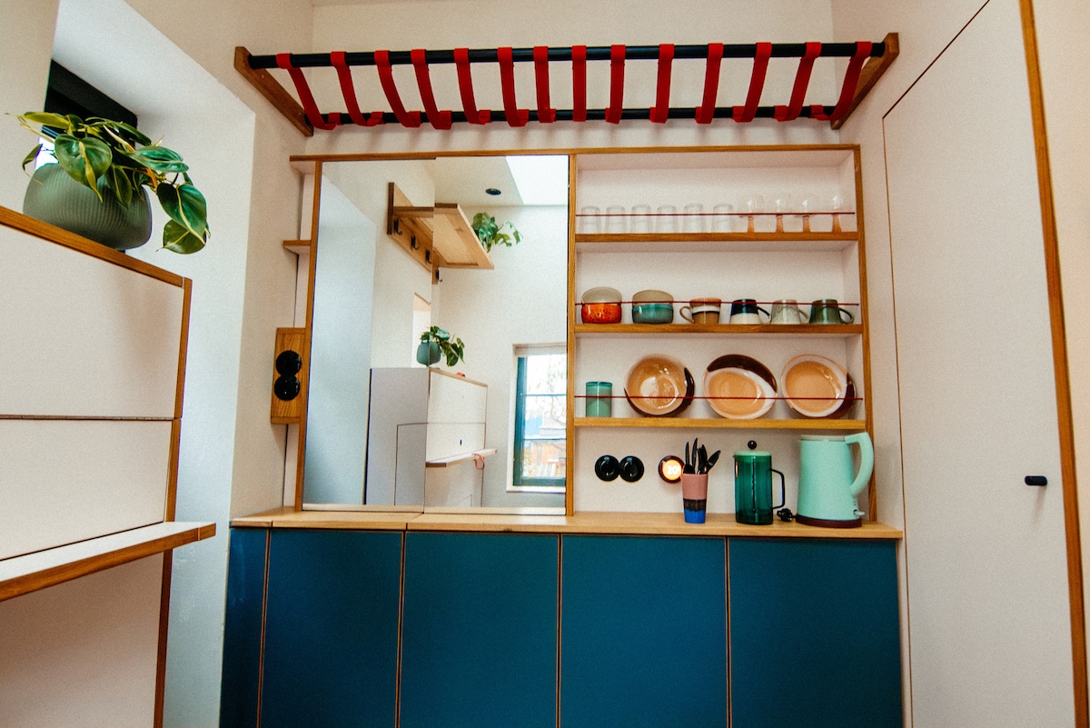 這間獨立公寓(約20平方公尺)位於我們房子的一樓,面向後院。 房間內有一張舒適的大雙人床(180 x 200)和一個休息區。通往獨立浴室的走廊上有一個設備齊全的小廚房,配有冰箱、爐子和烤箱。我們的房子位於市中心,步行5分鐘即可抵達所有景點,步行10分鐘即可抵達中央火車站。