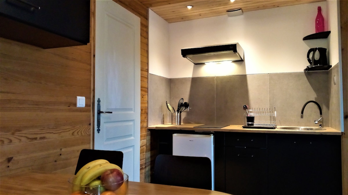 獨特的住宿體驗,置身於「哈比人」的氛圍中,坐落在一個野生花園的盡頭,可俯瞰城市景色。 通過徒步道(陡峭)進入。 住宿包括一間帶壁爐的客廳、一間小廚房、一間壁室、一間小浴室、一個可俯瞰山谷和城市(1公里)景觀的露臺,以及新增的木質加熱浴缸(夏季除外) 提供蠟燭和音樂,營造氛圍 非常適合情侶或永恆時刻的住宿!