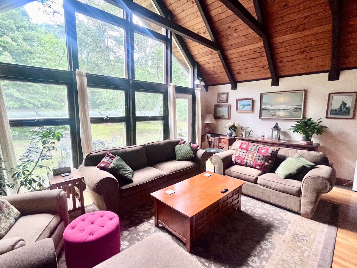 很棒的3張牀、2間全功能浴室的單人房。 兩個獨立翅膀的臥室。 設備齊全的廚房,配有中心島嶼和早餐吧。 大客廳、拱形天花板裸露的樑、俯瞰私人後院的地板到天花板窗。 中央空調、WiFi、智慧電視、洗衣機/烘乾機、戶外座位/用餐、火坑、室外淋浴間。 非常靠近科德角鐵路自行車道、餐廳、海灘、尼克森州立公園、高爾夫球場、商店。 可應要求允許攜帶狗;每晚30美元或每周150美元。
