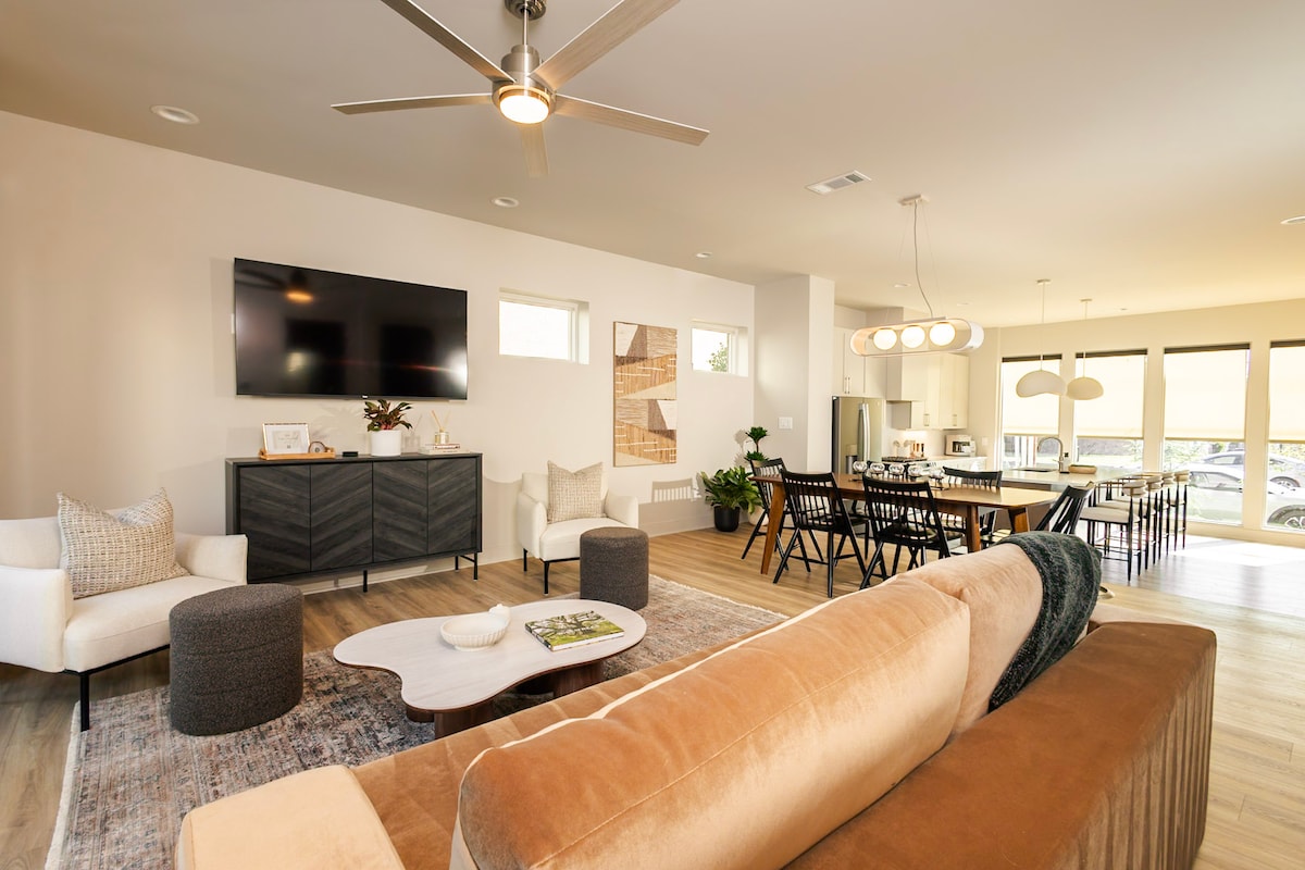 Whiskey & Wildflowers is your private 3BR spa-style retreat just 5 minutes from Broadway! Lounge in the cowboy pool, unwind in the cedar sauna, or relax on the covered back deck. Perfect for bachelorettes, birthdays, and weekend escapes. Inside, enjoy stylish decor, cozy living spaces, and everything you need for a comfortable stay. The backyard is fully fenced with turf—great for privacy and group hangouts. Less than a mile from Geodis Park and close to top spots.