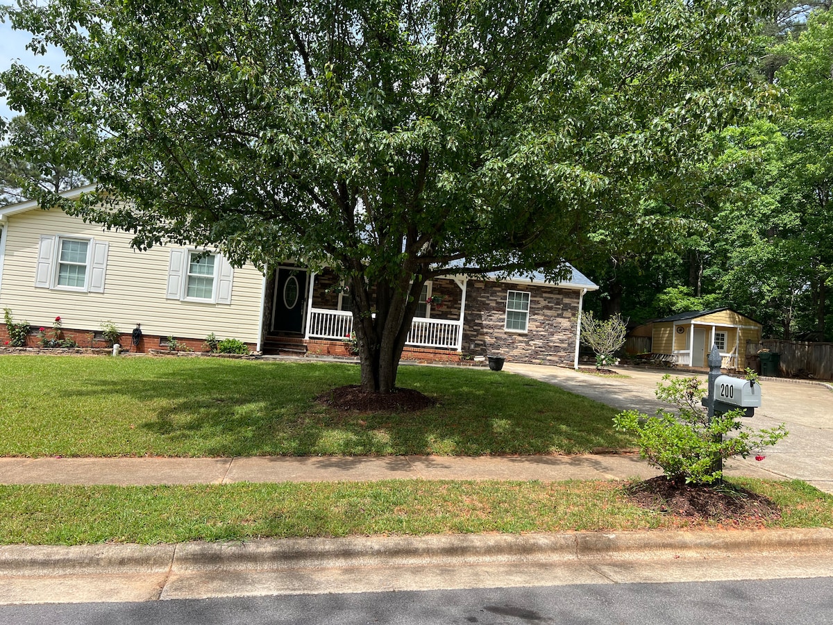 位於市中心,靠近RDU機場、RTP、Angus Barn、市中心、餐廳和商店。後院有圍欄,適合狗狗!Lvl-2 48amp電動車充電器,如有需要,可提供免費和清潔的毛巾/床單。登入您最喜愛的串流服務,可使用4臺智慧電視。2個辦公桌區域和非常好的WiFi!後院有烤肉和野餐桌,配有遮陽傘。現場泊車:車庫內有1輛車,車道內有2-3輛車。目前接受1晚預訂。查看我們的評價-看看房客的評價。