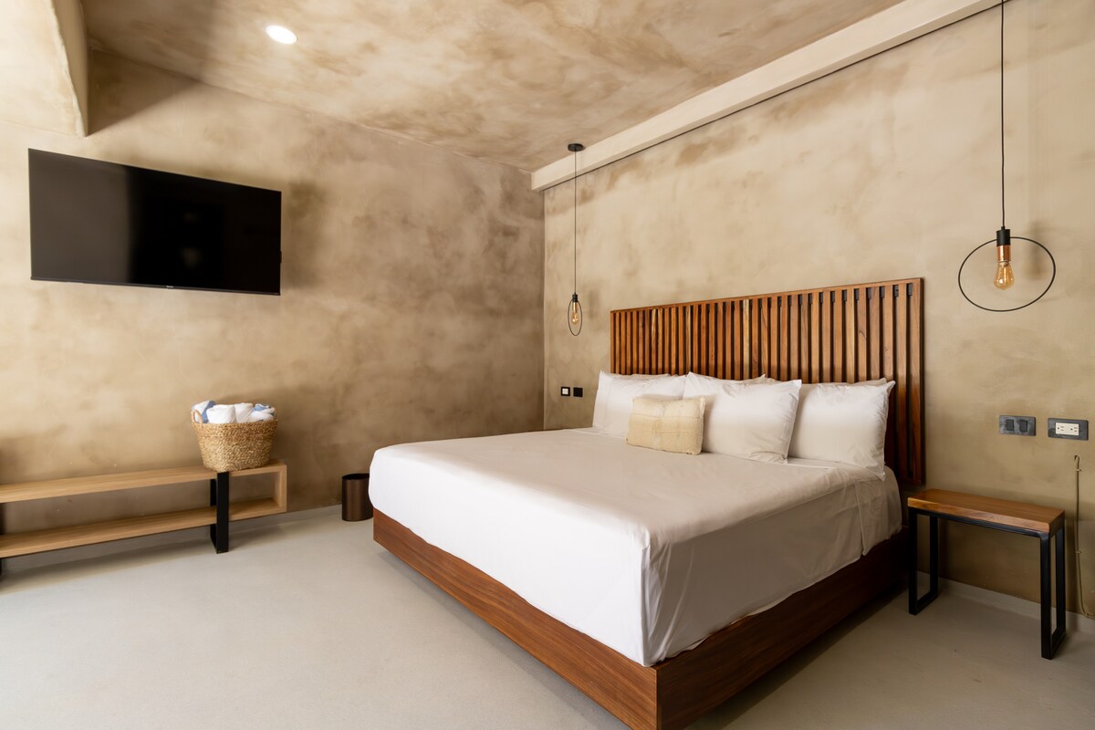 La habitación estándar está en planta baja, ofrece un espacio cómodo, fresco y tranquilo, ideal para descansar o trabajar remoto. Su diseño contemporáneo y tropical, crea una atmósfera relajante perfecta para una estancia agradable.
