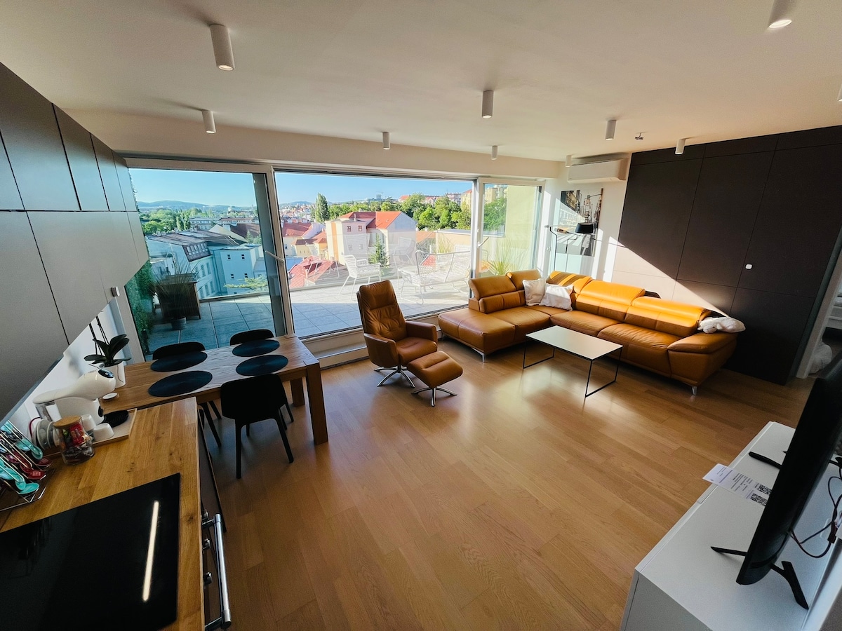 Gain an exciting experience in a new spacious apartment with the unique view from its grand terrace. It is just 10 mins by tram from the center of Brno. It is great for couples, families with kids or business travellers. You will appreciate the spacious and modern living room with stylish details. Grand terrace with a charcoal grill, sunbeds and the amazing view that will make your stay much more comfy. The whole apartment is air-conditioned.