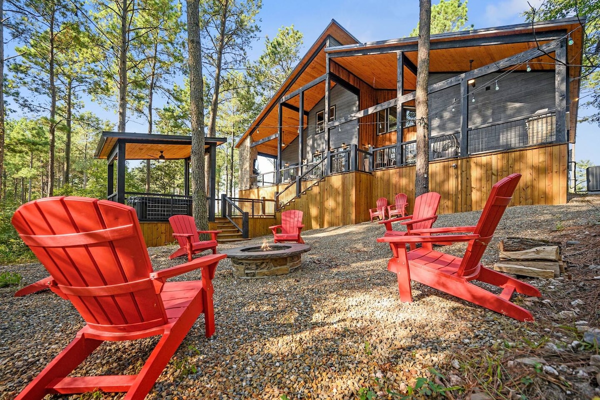 Welcome to The Preserve, a stunning Scandinavian-style cabin nestled on 2.5 acres in the heart of nature, where million-dollar views of the Kiamichi Mountains await! This luxurious retreat features designer finishes, an expansive 2000 sq. ft. of outdoor living space, and amenities galore, including a heated pool, hot tub with panoramic views, a putting green, and outdoor grilling area. Accommodating 10-12 guests, The Preserve boasts four beautifully appointed bedrooms and 3.5 bathrooms, ensuring