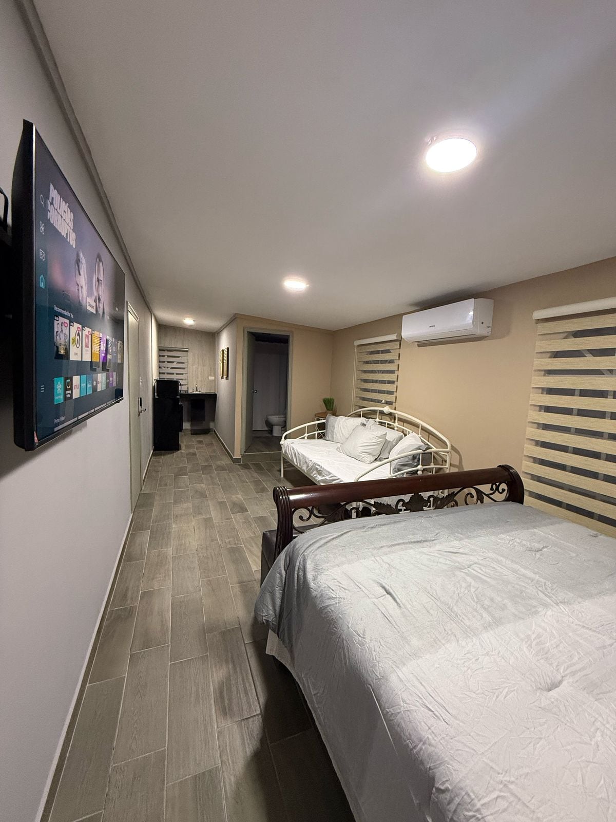 寬敞的公寓,配有小廚房(冰箱、微波爐、牆上掛板作為早餐桌)。 全套衛浴設施,冷熱水、扶手。 QUEEN 尺寸床、40 吋智慧型電視。網路。物業內有停車位。