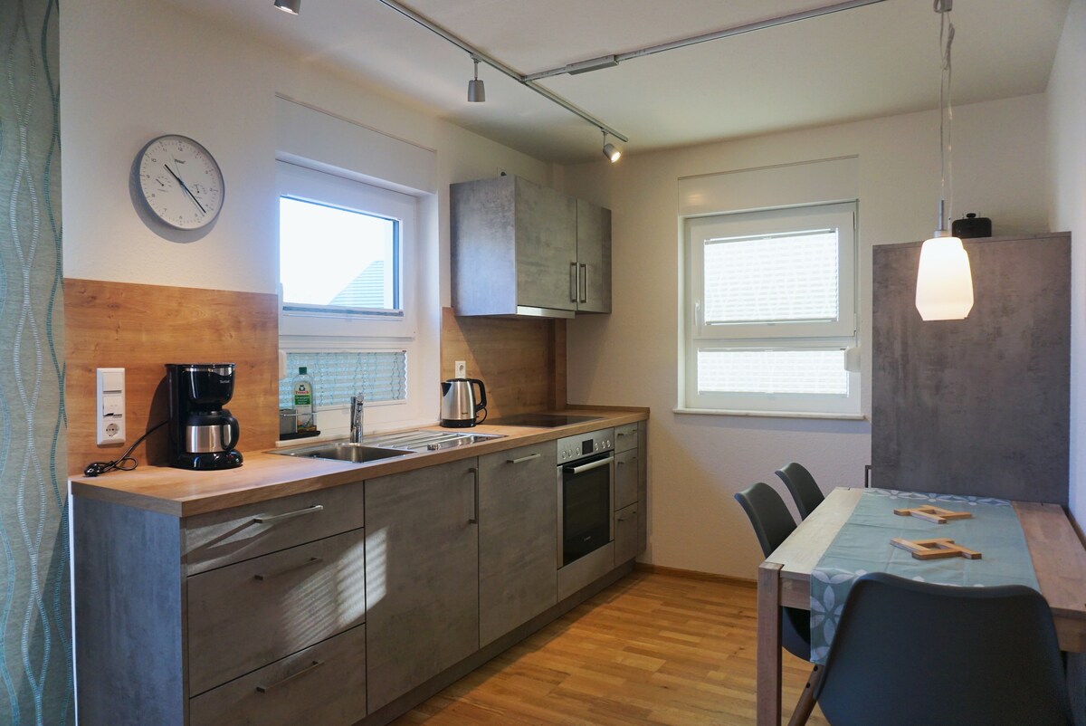 現代、陽光充足的公寓100平方公尺, 2位房客, 1間臥室、1間帶桑拿的浴室、1間客廳、廚房、陽臺、 免費停車位。最少預訂: 3天 我們很樂意在Wiesloch火車站搭乘火車接送旅客。 裝潢舒適的公寓位於我們兩戶住宅的二樓,有自己的入口,可欣賞Kraichgau山的廣闊景觀,以及位於死胡同中的安靜位置。 房子由太陽能和沼氣供暖。