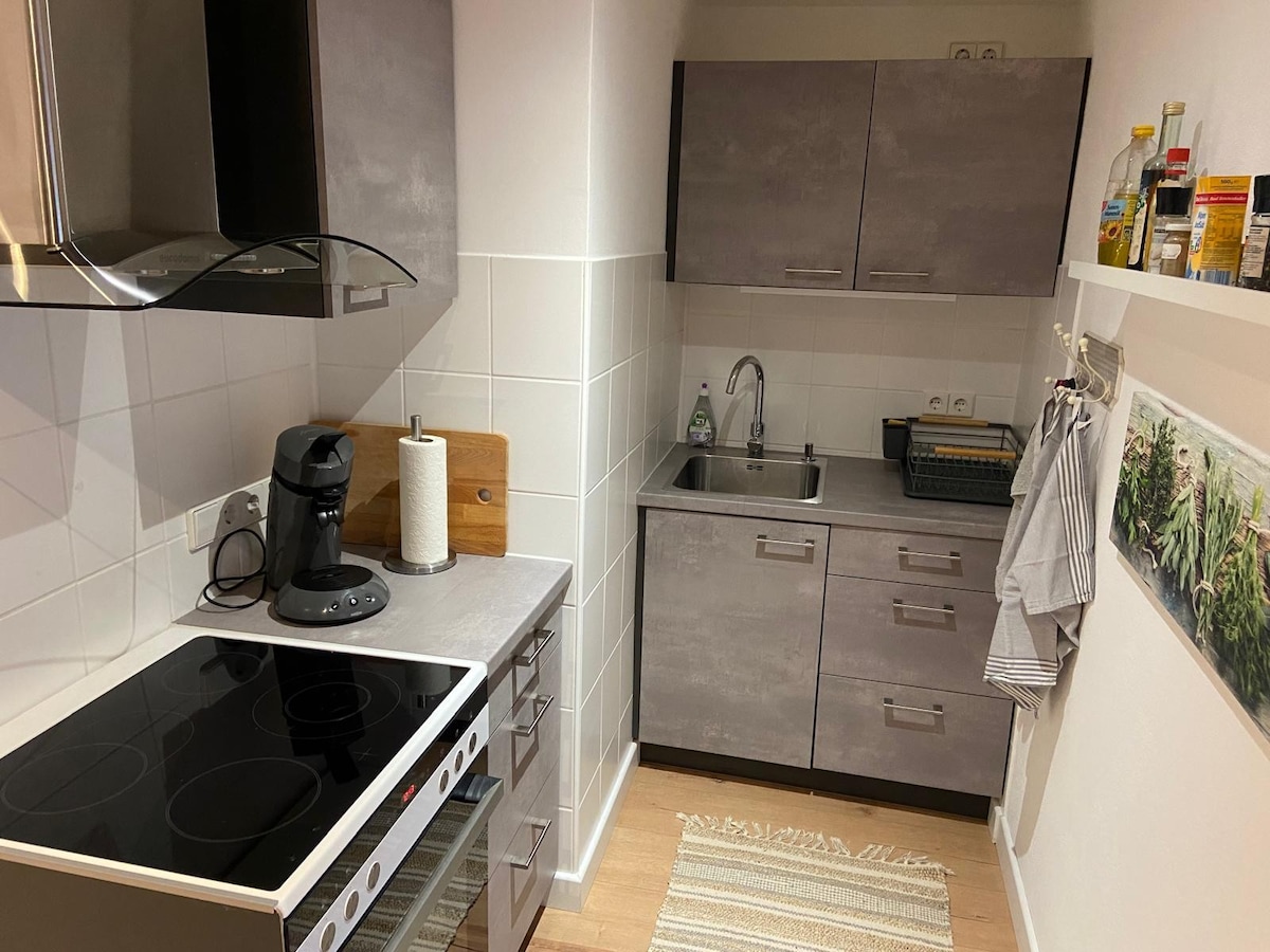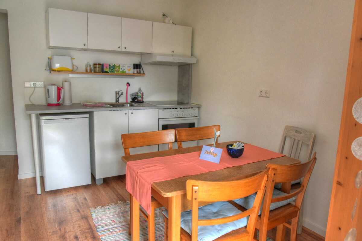 歡迎來到我們舒適的度假屋! 單間公寓位於我們大型家庭住宅的一樓,並有獨立的入口。 臥室又大又明亮,有通往花園的出口。 在臥室裡,您會發現一張加大雙人牀,包括兩張單人牀墊、衣櫃、梳妝臺、一張桌子和兩張沙發。 小廚房設備精良,可自給自足。 早餐是可選的,但需額外付費(每人5歐元)。 在最近翻修的浴室,我們會提供毛巾。