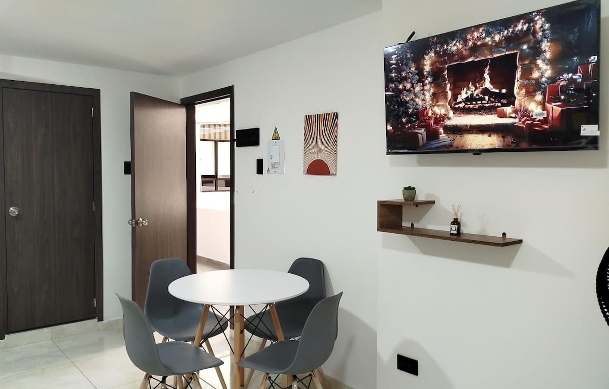 Vive una experiencia única en este apartamento nuevo y céntrico. Con un diseño moderno, cuenta con sala con sofacama, estudio, cocina equipada, habitación con cama doble y 1 baño con ducha tipo lluvia, para garantizar tu descanso. Tendrás todo lo que necesitas para una estadía cómoda. La vista panorámica de la ciudad hará que tu estancia sea inolvidable. Ideal para viajes de trabajo o de descanso.