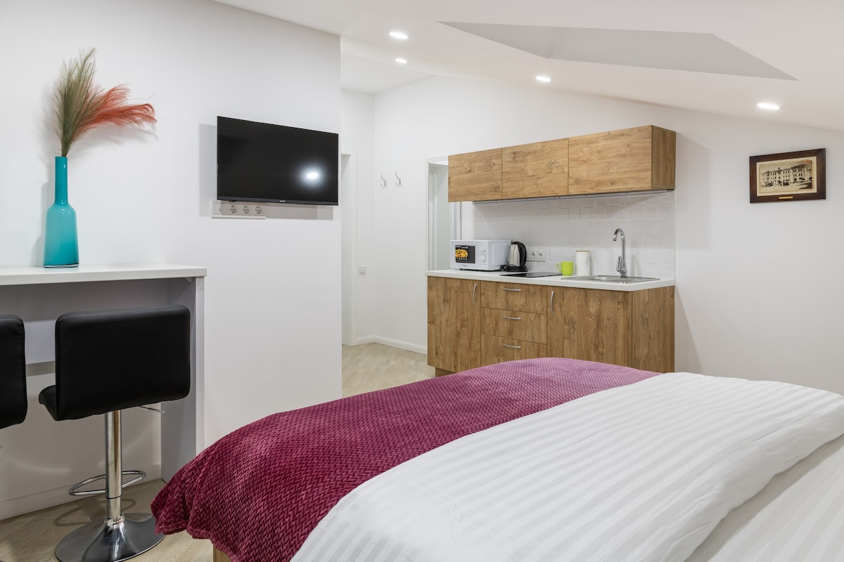 Hi there! My name is Julia and I am excited to welcome you at my brand-new designer apartments (32 sqm) in Kiev. I am pleased to share with you this stylish contemporary apartment features an open-concept layout, wood surfaces, and tasteful decor. Here you can find everything you might need for your stay - high quality bed linen, hairdryer, iron, bath accessories and more. Feel free to start your day with a cup of a lovely coffee or tea of your choice as a compliment for your stay. Welcome home!