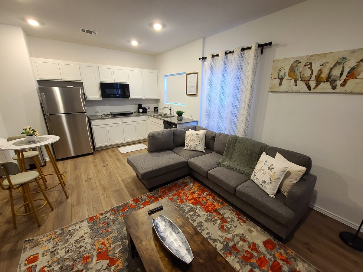 您可以全部享受美麗的1000平方英尺二樓公寓。 有兩間全功能浴室和一間獨立臥室,以及一張全尺寸的沙發牀。 設備齊全的廚房、美麗的露臺,配備燒烤架、洗衣機和烘乾機、WiFi、充足的停車位和充足的鄉村魅力。5分鐘即可抵達130 Toll Road , 20分鐘至COTA。20分鐘至奧斯汀市中心, 15分鐘至聖馬科斯。 地理位置優越,在訪問該地區時可以看到這一切!