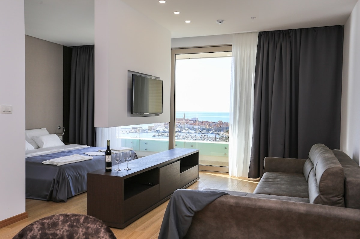 Enjoy this centrally located apartment with an amazing view of the Old city of Budva and city beach. The apartment is about 47m2 and it is located on the 11th floor of hotel WoW, just 30 meters from the beach. The perfect base for both business and leisuretravelers.Apartment has all necessary house amenities (free wi-fi, cable tv, fridge, stove, oven, iron, hair dryer, washing machine)Guests can use hotel WoW restaurant on ground floor. Breakfast (buffet)10€ per person and Dinner(buffet) 15€