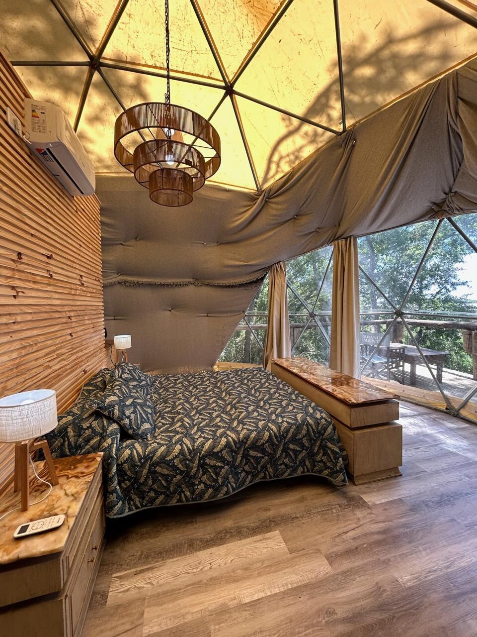 Ingresas por escalera a su terraza de 2 m de altura solarium privado, amueblado. En la tienda, cómoda cama queen, ropa de cama, mantas, juego de almohadas, mesitas de noche, enchufes, calefacción frio/calor Living con vista al campo, pava eléctrica y minibar. Infusiones de cortesía. Baño privado en la tienda, toallas y toallón por persona 80 m2 de ambientes únicos y privados, cama de red en altura para ver las estrellas Espacio de relax en jacuzzi con hidromasaje privado y sales energéticas