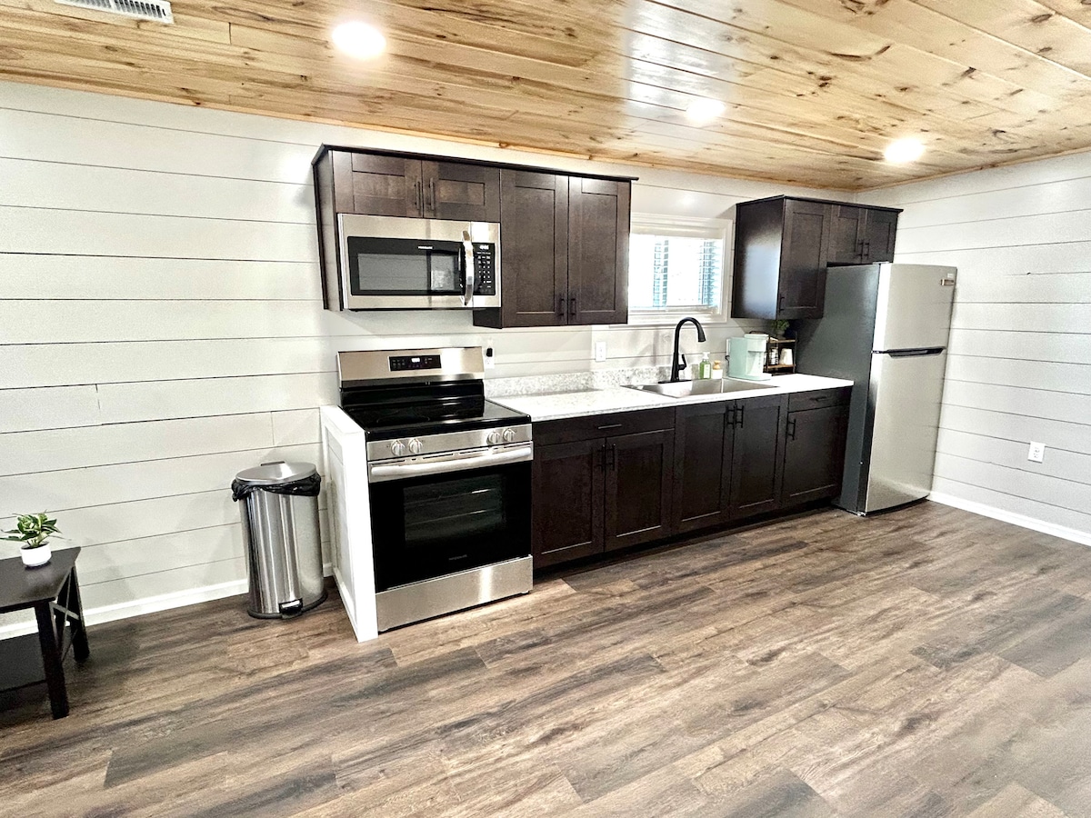 一間大房間有1張雙人牀和一張日式牀墊,如有需要,我們可以新增一張折疊雙人牀。 全功能浴室,配備淋浴間和水槽。 配備冷凍庫的全尺寸冰箱、帶烤箱的電爐、帶Netflix的大屏幕電視、Hulu等。 全新Serta牀墊、全新硬木地板、高速WiFi、靠近城鎮,但沒有鄰居,獨立入口。 靠近高速公路,靠近門口的越野停車位。 非常有禮貌的寵物,不太有禮貌的人。