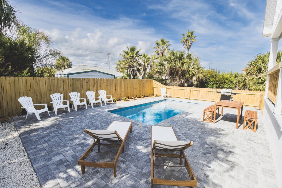 2022年全新的海灘邊的套房平房!非常適合浪漫度假或單人入住,距離海灘僅600步。距離聖奧古斯汀碼頭5分鐘,距離美國最古老的城市歷史悠久的聖奧古斯汀市中心10分鐘。 不僅有最舒適的床,還有50英寸電視、躺椅和令人驚嘆的溫水游泳池。 美麗的海灘日出、釣魚、徒步旅行、露天劇場的音樂會。 為了您的安全,您有一個電子無鑰匙入口。