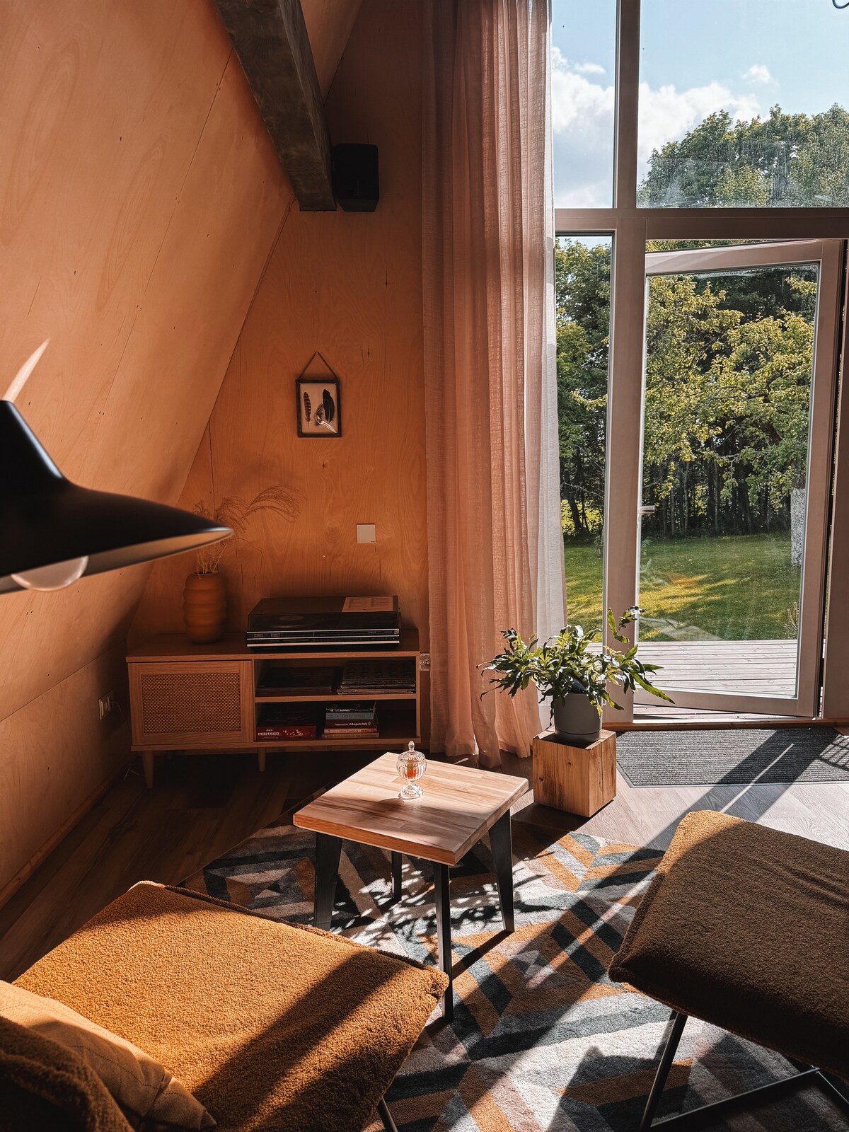 Mulberry House A2 is a cozy A-frame cabin designed for two, nestled in a peaceful orchard near the lakes and rolling hills of the Stakliškės–Aukštadvaris region. The cabin includes one bedroom, a private bathroom with shower, air conditioning, underfloor heating, Wi-Fi, and a small kitchen with a stove and fridge. Enjoy a private terrace for morning coffee or stargazing, plus a grill & chill zone. Perfect for a romantic weekend or a longer stay in nature – with comfort always close at hand.