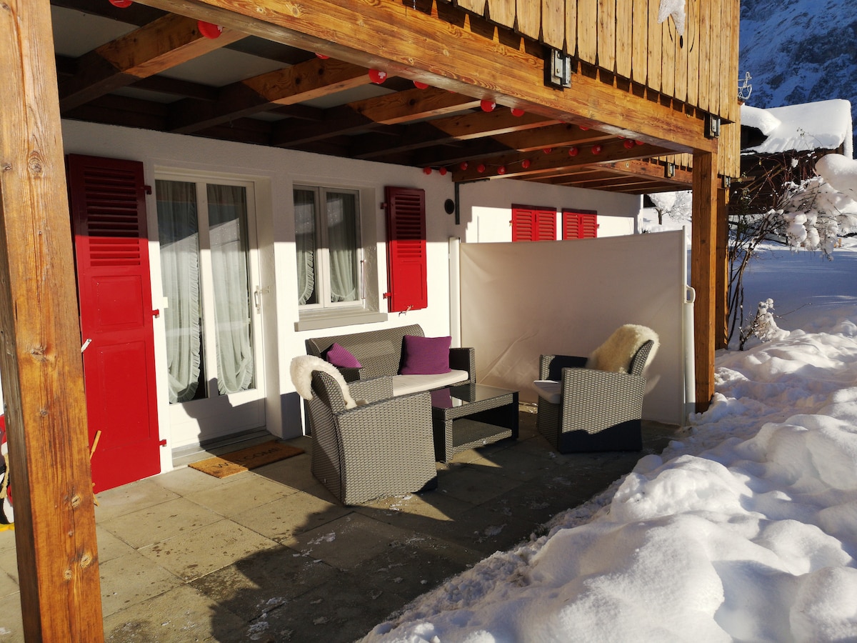 我們的 35 平方公尺單間公寓位於最美麗、最安靜和最放鬆的位置,步行 12 分鐘或開車 4 分鐘即可抵達 Grindelwald 火車站。您可以在私人有蓋露臺的花園休息室欣賞美景。設備齊全的廚房配有烤箱和 4 個爐灶,讓您盡情烹飪。在舒適的箱式彈簧床上,就像在飯店裡一樣,沒有什麼能阻礙您的休息和放鬆睡眠。