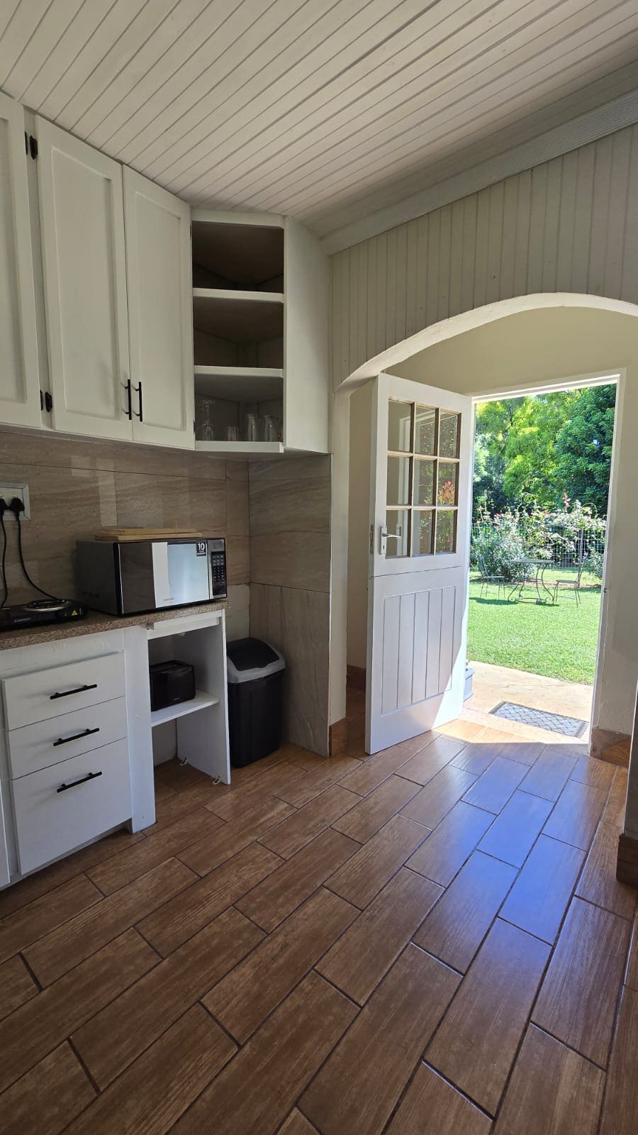 Large open plan bedroom with open truss ceilings, wooden floors and a large cupboard with kitchenette and bathroom which consists of a shower, toilet and basin. The unit uses a gas geyser. Wifi and tv run off an inverter during power outages. This unit is not equipped for cooking, but an air-fryer is provided. These units have wooden floors which some guests may find noisy.