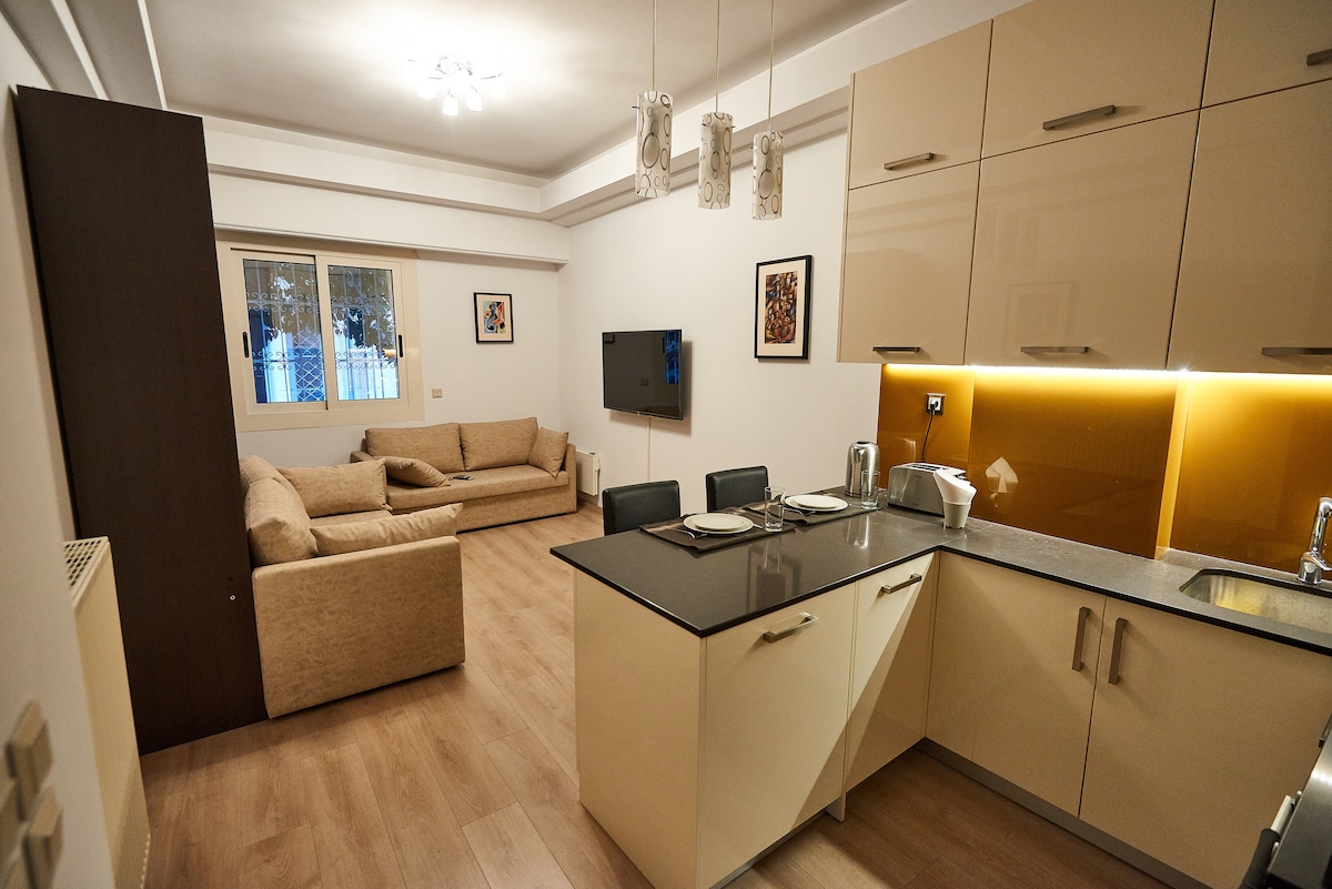 現代舒適的單間公寓,可舒適容納單人或情侶。設備精良的廚房,備有冰箱、炊具和洗碗機、舒適的浴室和淋浴間。它有一張壁床,不需要時可以輕鬆折疊,為小客廳創造空間,讓您放鬆身心,觀看大電視。全屋空調。它位於科隆納基市中心安靜街區的一棟大樓的一樓,是雅典最美麗的中心區域之一。