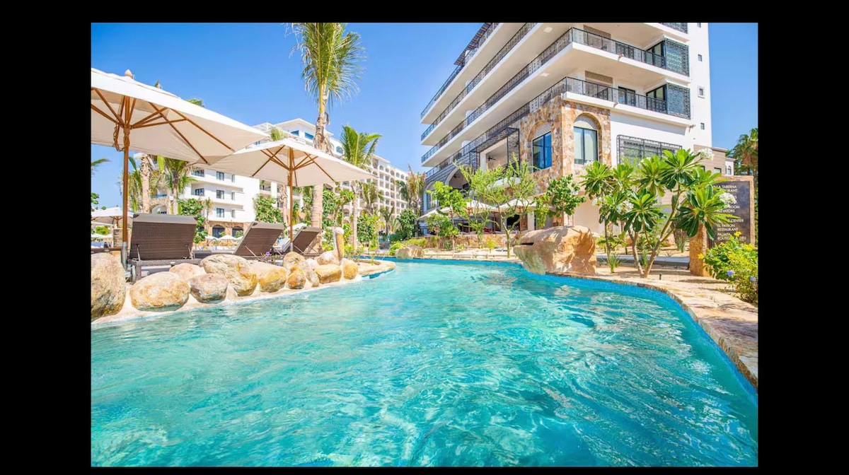 位於卡波最佳可游泳海灘的Villa del Palmar海濱天堂! 這間時尚的單間公寓設有設備齊全的小廚房、私人陽臺和世界一流的度假村設施,包括無邊際泳池、水療中心、健身中心和多家餐廳。 距離卡波市中心的餐廳和夜生活僅幾步之遙,但足以讓您完全放鬆身心。 非常適合尋求奢華而不包含全包價格的情侶或獨自旅客。 難忘的卡波假期等著你