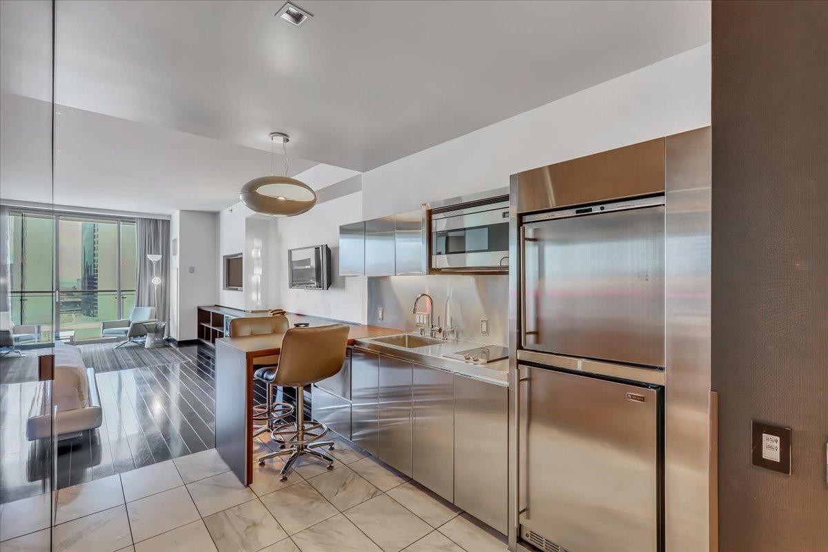 罕見的頂層公寓單間公寓,配有延長陽臺,可欣賞拉斯維加斯城市燈光的迷人景色! 設備齊全的交鑰匙套房,配有小廚房,配有Subzero和Miele電器、花崗巖櫃檯、內置娛樂中心和配有保險箱的衣櫃。 單位可供4人舒適入住,配有毛絨加大雙人牀( Tempurpedic )、拉出式加大雙人牀沙發和記憶纖維加大雙人牀枕頭、配有按摩浴缸噴射流的豪華浴室、他的水槽、溫水泳池、水療中心和懶人河。 沒有度假村或隱藏費用。免費 代客泊車。