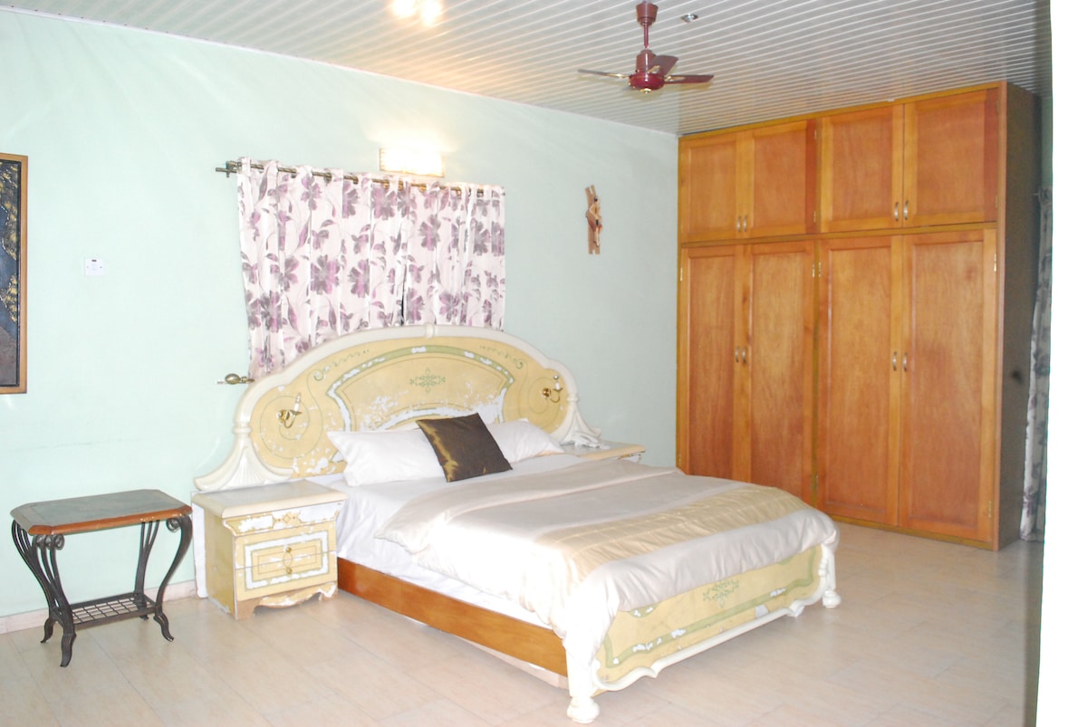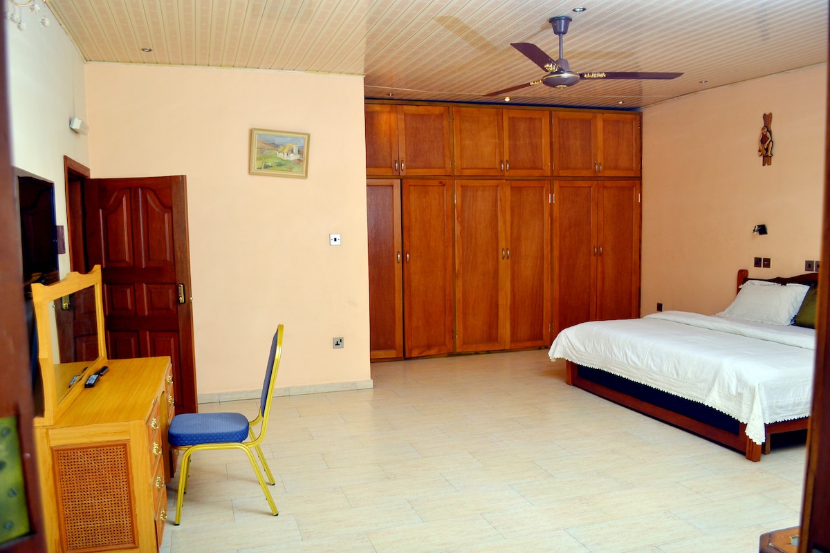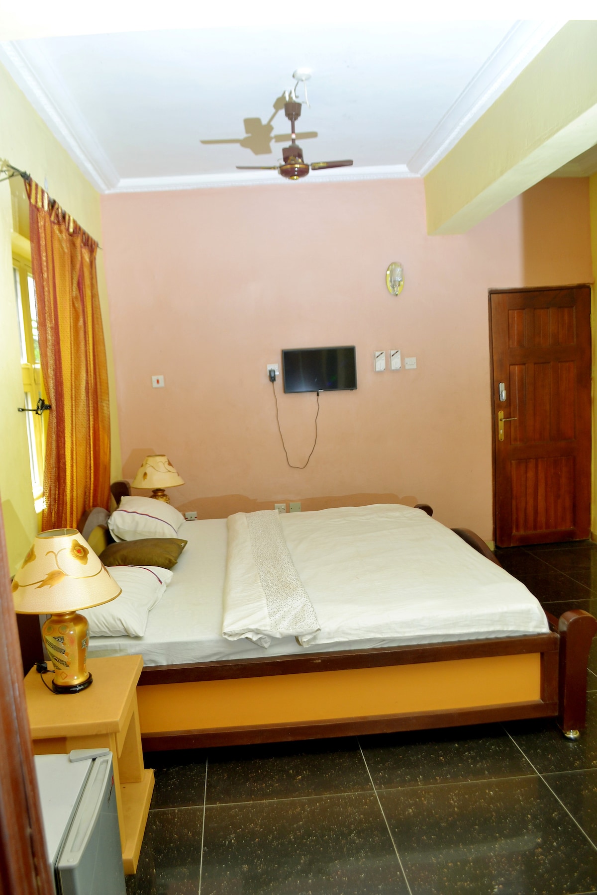Ekanem has a special bed with a really soft padded mattress on an electronic bed with bedside lamps and stools. it a double bed with a really shiny floor tiling and a well decorated ceiling. it has a fan, 32 inches TV and a balcony. the powerful AC and water heater makes life interesting. its located at the main building which make the wifi network really strong. It has a bath tub and a telephone shower for the ladies.