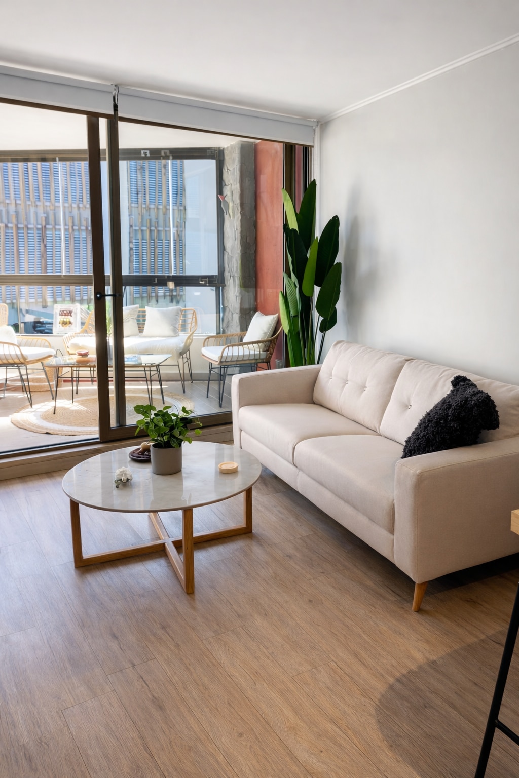 Nuevo y acogedor estudio en la mejor ubicación de Pucón, a pasos de playa grande, centro, y aislado del ruido de la calle principal. Cuenta con cama de 2 plazas, un futón de 2 plazas, cocina full equipada, baño completo, WiFi, TV 49" con Netflix, Disney+ y más, terraza, calefacción, parrilla, cafeteras, 2 bicicletas de uso ilimitado, entre otros. Estacionamiento público frente al acceso al edificio disponible. Incluye ropa de cama, toallas, e insumos básicos de baño y cocina para cada estadía.