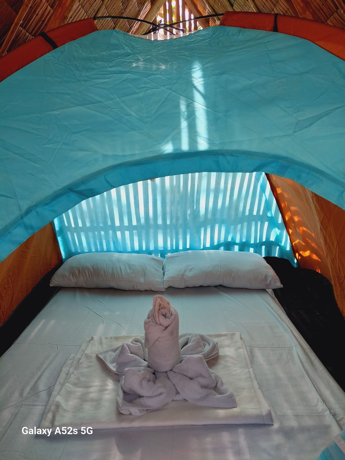 在我們的側面海景Kubo帳篷或部分海景中,您可以在不犧牲舒適的情況下逃離大自然,這是一個迷人而實用的度假勝地,專為短期和長期住宿而設計。 - 🔌 充電插座 - 讓風扇🌀帶來舒適感 - 🛏️ 完整寢具 - 🌦️ 耐候設計:能夠抵禦雨水和極端高溫,在各種天氣狀況下都能提供可靠的庇護。 - 🚿 共用衛浴