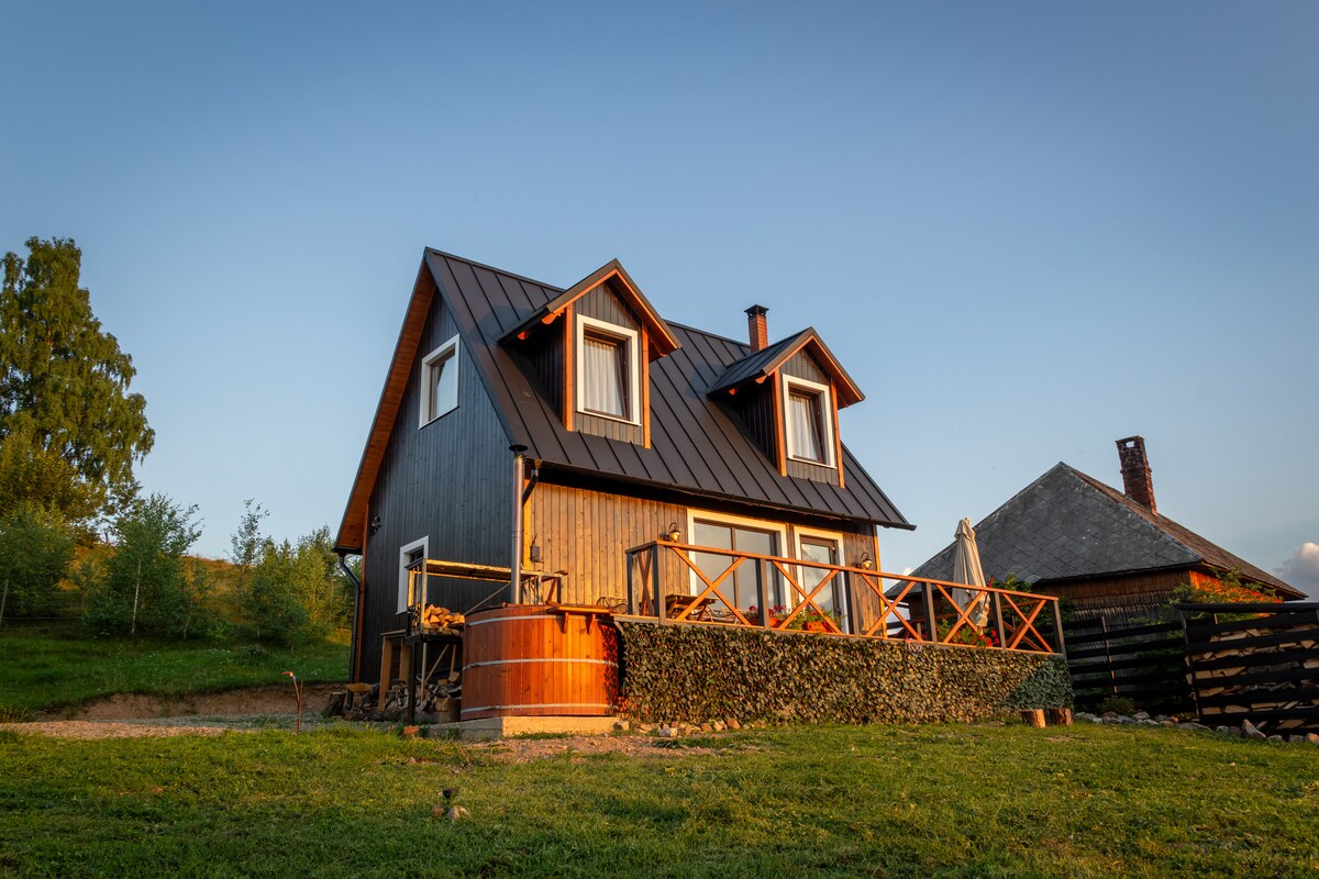 全新-按摩浴缸- 200 LEI/2天住宿 小屋位於美麗的Dealu Negru (黑山)村,距離繁忙且不斷發展的克盧日-納波卡市(Cluj-Napoca)1小時車程。 在這個房源中長大,小木屋代表了我勤奮工作的父親親手建造的終身夢想,您會在周圍的細節中注意到他的天賦(特別注意天花板,您可以注意到鏡面木板,精心佈置以代表樹的長度)。