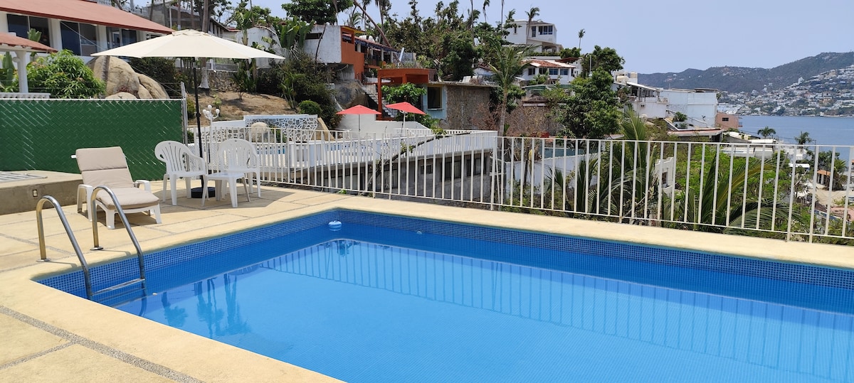 舒適的公寓,可欣賞阿卡普爾科灣的美景。私密且沒有噪音,讓您度過愉快的假期。 兩間臥室、兩間全套浴室、設備齊全的廚房、空調和天花板風扇,讓整個公寓保持涼爽。 游泳池距離您僅幾步之遙,可欣賞美景。 公寓最近翻新過,所以大部分都是新的,可供您使用。 地理位置優越,可前往享受海灘。