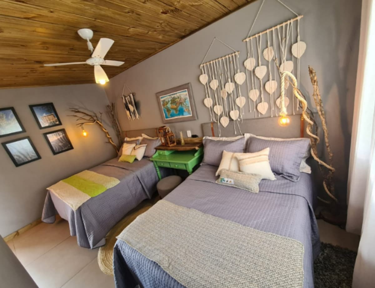 Suíte configurada com duas camas de casal, wi-fi, tv a cabo, ar condicionado, frigobar, secador de cabelo, ventilador de teto, chuveiro a gás e área externa privativa com fogo de chão.