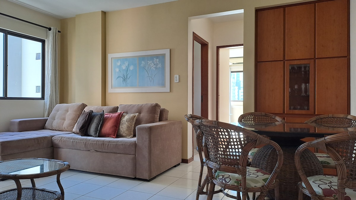 Lindo Apartamento a 30 metros da Praia, com Vista para o Mar e Cidade, amplo, ventilado, climatizado, equipado, REDE DE PROTEÇÃO nas janelas e na sacada.Sala de estar com Tv, Sala de Jantar com churrasqueira, Cozinha com espaço para refeição, espaços amplos e integrados permitindo interação entre os hóspedes. A Sacada tem vista para o Mar e cidade, com mesa e cadeiras, oferecendo momentos incríveis: tomar café, happy hour, trabalho. Ar condicionado nos quartos. 2 GARAGENS INDIVIDUAIS
