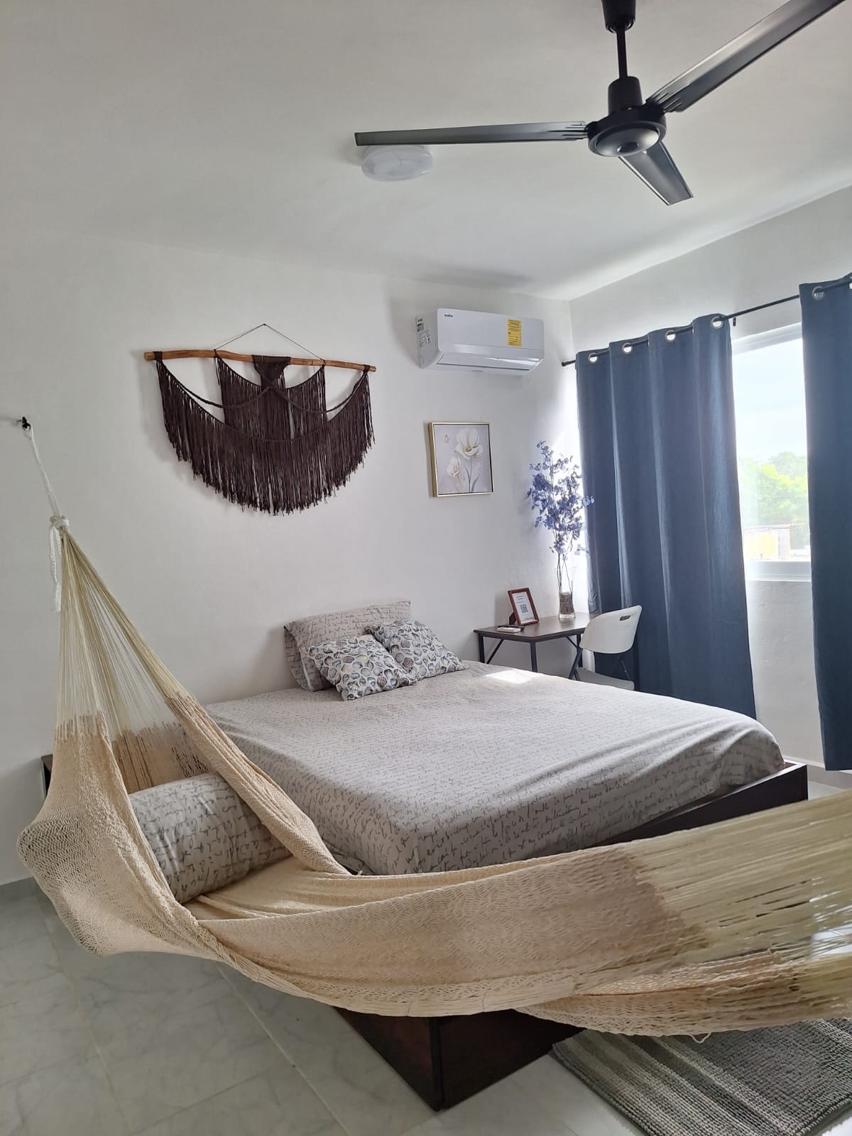 Departamento amplio cómodo con 1 habitación y 2 camas matrimoniales. En la cocina encontraras : parrilla de inducción, freidora, licuadoras, comedor para 4 personas, y una pequeña estancia trasera ideal para relajarse al atardecer o tomar un café por la mañana. La ubicación es excelente, ya que está cerca de supermercados, restaurantes, y transporte público. Sin duda, este departamento es una opción perfecta para quienes buscan un lugar acogedor y bien equipado para su estancia.