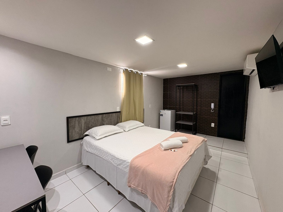 Flat aconchegante com cama de casal, ideal para quem busca conforto e praticidade. Ambiente climatizado, decoração moderna, Wi-Fi rápido, Smart TV e banheiro privativo. Localização estratégica e segura. Perfeito para estadias rápidas ou longas, oferecendo o melhor custo-benefício da cidade.