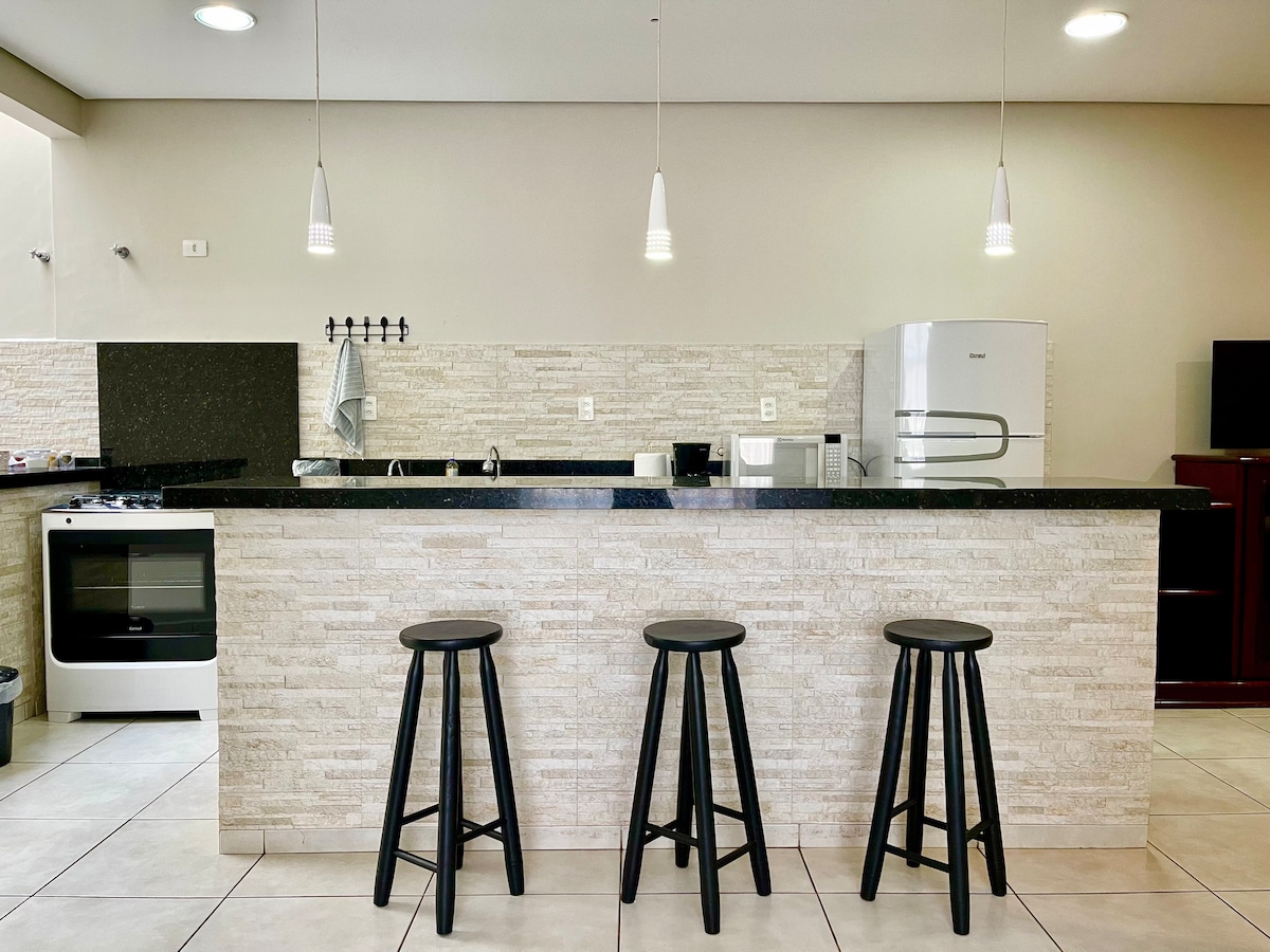 Este lugar especial fica perto de tudo e é ideal para planejar sua visita. com TV, ar condicionado, Frigobar, internet, local privilegiado ao Lado do Bosque Municipal Tem opção de suite Térreo ou segundo andar conforme a preferência. Também possui câmeras de segurança, cerca elétrica e portão eletrônico, garagem gratuita para 3 veículos com cobertura e 4 sem cobertura , Imóvel Novo.
