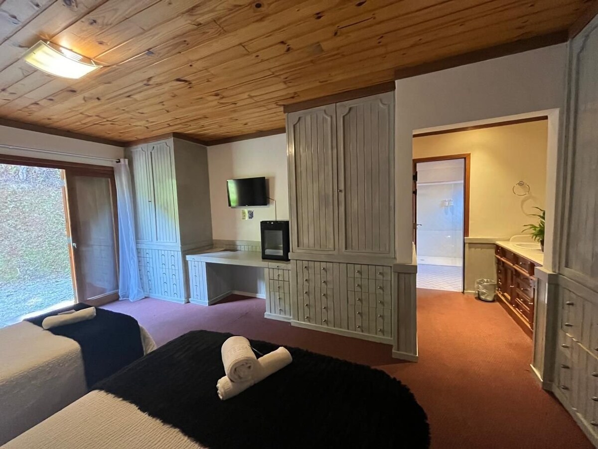 Quarto conjugado espaçoso e confortável com acesso para nosso jardim, ideal para receber sua família. Equipado com TV smart e frigobar. O quarto é composto por uma cama de casal e uma cama de solteiro, e, no outro quarto com uma cama de casal. Esse quarto está localizado na Pousada Capivari Lodge, no bairro Alto Capivari.