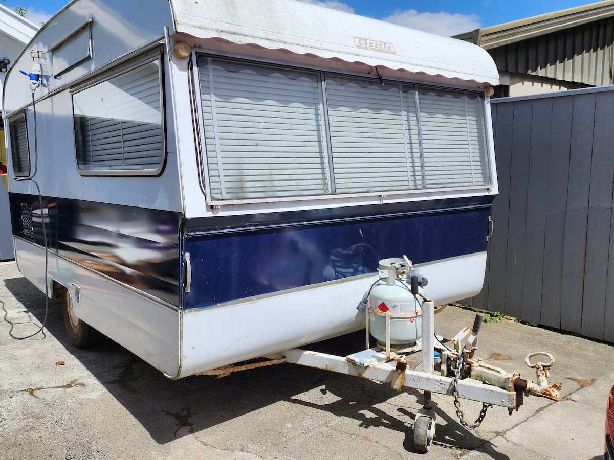 * * *不適合需要不間斷WiFi連線的房客在家工作* * * 這個小寶石已經是我們的家庭大篷車超過45年了! 室內裝潢是原創的,唯一的補充是用於存儲和微波爐的空間。 *前面有雙人單人牀 *後面的廚房,配有小冰箱、微波爐和充足的長凳空間 *內置大量儲存空間 *衣袍存放處有8個立方體 請勿帶小孩入住。