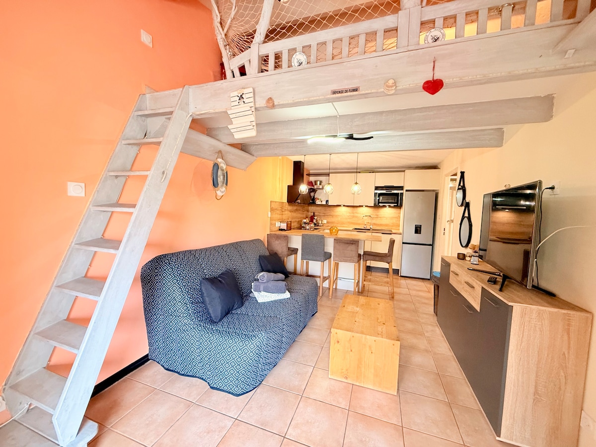 🗝️ 每晚或每週出租 漁夫📍島,Cap d 'Agde (34300) 📺舒適和設備精良的公寓 (可逆式空調、Wi-Fi、智慧電視、咖啡機、冰箱冷凍庫、微波爐、爐子) 🛌 1張沙發牀,可供2人入住 提供🧺 牀上用品 🌊凸肚窗海景 🔐 安全居住 住宅前面有🚗免費泊車設施設施設施設 距離商店 50 🏪 公尺 🏖距離海灘500公尺 距離港口800🛥公尺