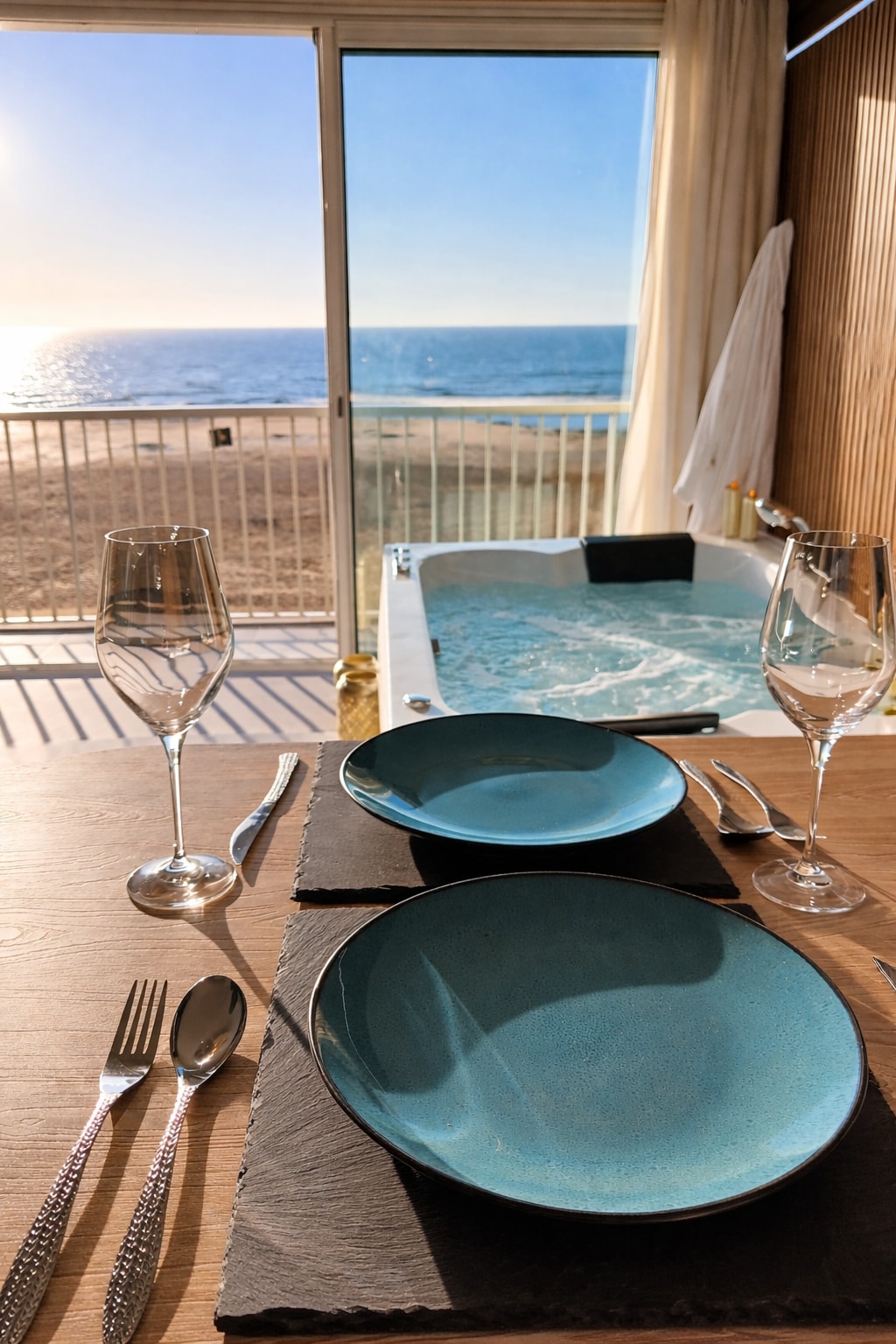 L'Instant Suspendu: Spa Suite & Endless Horizon Experience the unique magic of the only beachfront balneotherapy suite ❤️. Your private whirlpool bath, set right against the floor-to-ceiling windows: a hypnotic, face-to-face encounter with the Mediterranean. Emotion: Watch the sunrise from the comfort of your bath or your private balcony. Comfort: Feet in the sand, High-speed Fiber Wi-Fi, and natural cooling with a ceiling fan. Location: 3rd floor with direct beach access—no roads to cross