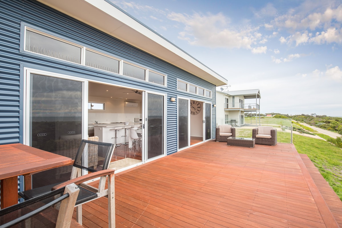 Perched high on a hill overlooking the harbour, the 180 degree views over Robe, will create a mesmerising backdrop to your relaxing getaway. Enjoy the view from your designer open-plan living space, with dining for 8 guests, a big comfy lounge, and a sunny window seat to read or dream.