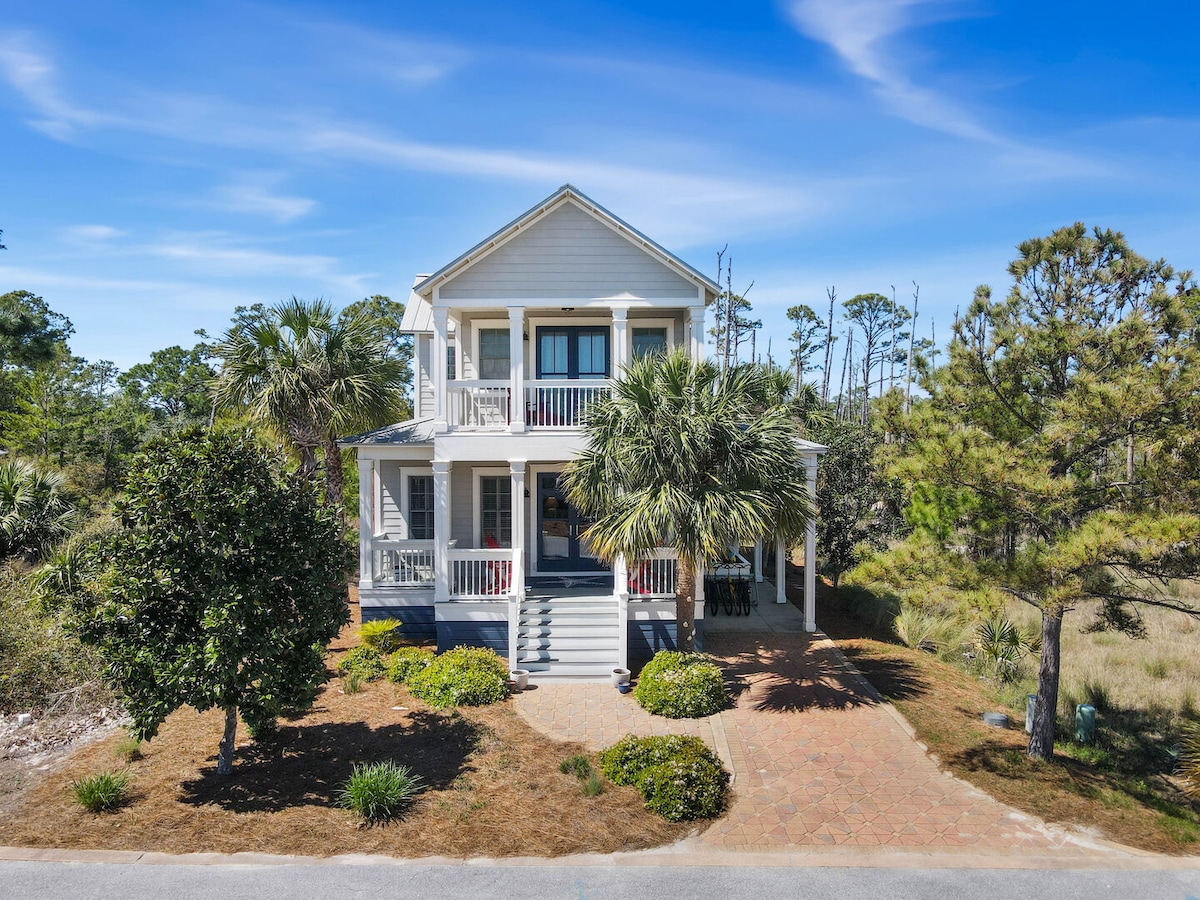 Shimmering Tides是一個完美的僻靜房源,坐落在迷人的Windmark Beach社區的盡頭。非常私人的房源,非常適合創造回憶和放鬆!在您放鬆觀賞日落時,門廊可以讓海灣微風流入。木板步道位置便利,距離房源幾步之遙,不到5分鐘即可直接抵達糖果沙灘和海灘。寬敞的後院、火坑、所有海灘設備和高爾夫球車!