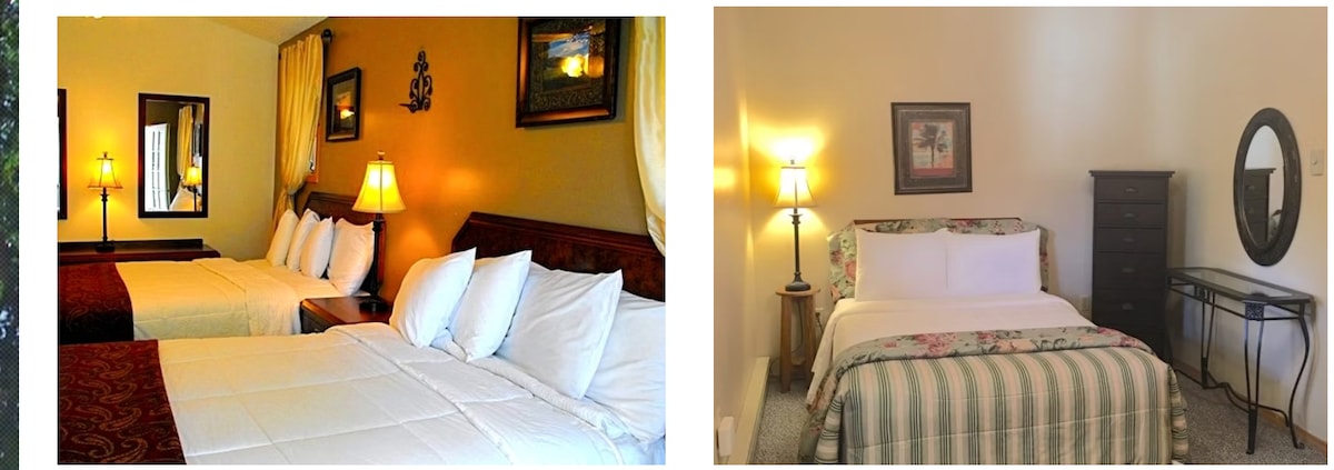 Perfect for families or groups traveling together, this spacious 2-bedroom, 2-bath suite sleeps up to 9 with four queen beds plus a futon—a rare find in Lake George. Enjoy a full kitchen, cozy living area, and warm Adirondack charm. Located at The Sundowner, just steps from the pool, hot tub, sandy beach, and free kayaks, paddleboards, canoe, and rowboat, plus walkable village attractions. This is a lively, central property—ideal for guests who plan to be out enjoying the lake and town.