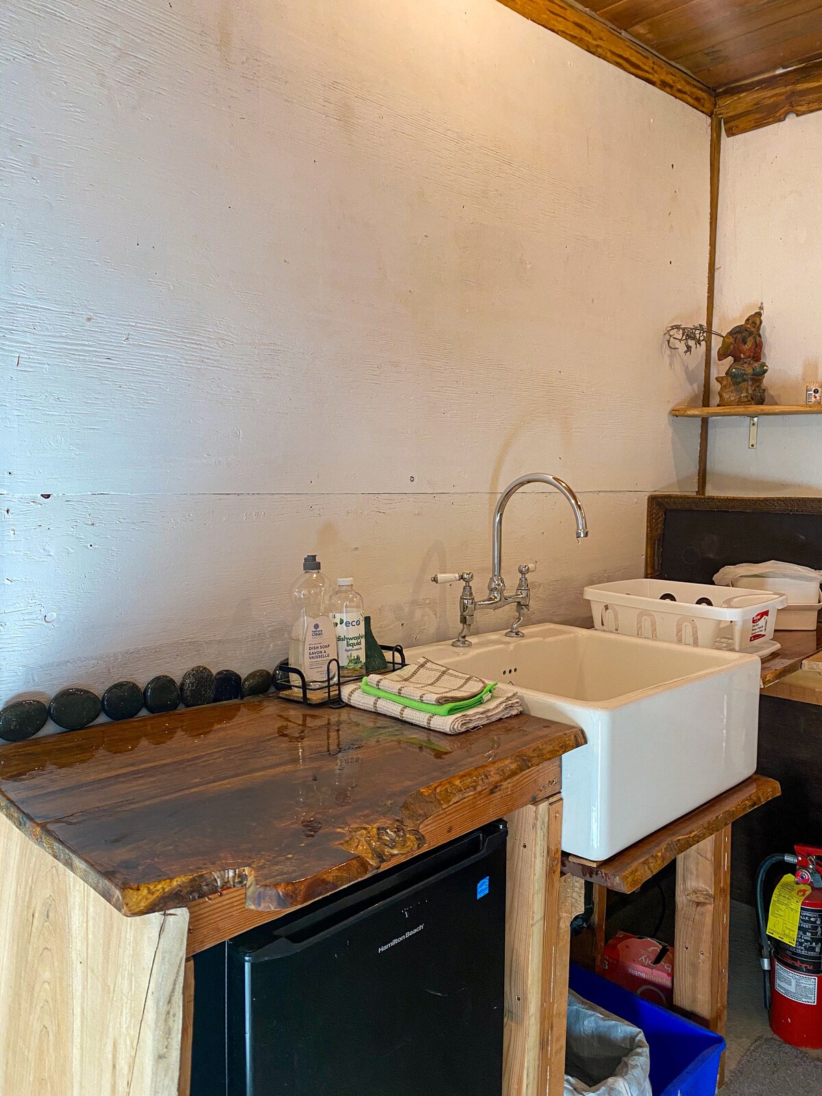 This rustic off-grid micro cabin is 106 sq. ft. but feels much bigger, nicely nestled away in the mossy forest. Sleeps two in a queen bed in the loft. Minutes from surfing and hiking trails, you’re in the right place for epic adventures. We built our cabin using mainly reclaimed materials. We wanted to build a place that had minimal impact on the environment. It has on demand hot water, rainwater catchment, and solar powered electricity. We also have a beautiful sauna available to rent.