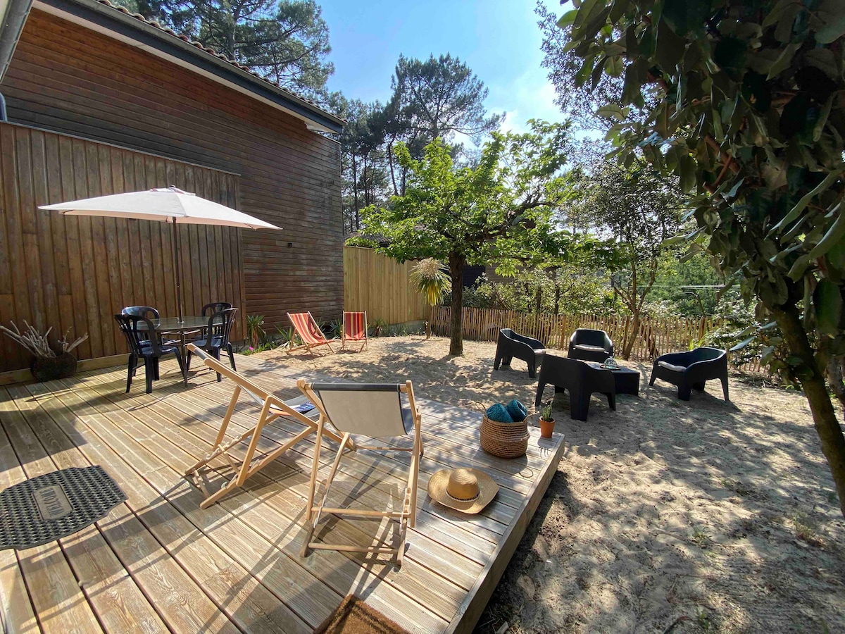 半獨立房屋,有圍欄花園,距離大海50公尺,在鬆樹之間。 直接開入海灘。 商店在 100 公尺處。 Lac de maubuisson距離活動3公裏,距離Lacanau高爾夫球場10公裏 空調、電動捲簾、高速WiFi、電視 1個朝西的陽光木製露臺。 戶外噴水器。 平底鍋和戶外座椅 免費用的停車位 包括清潔和牀上用品